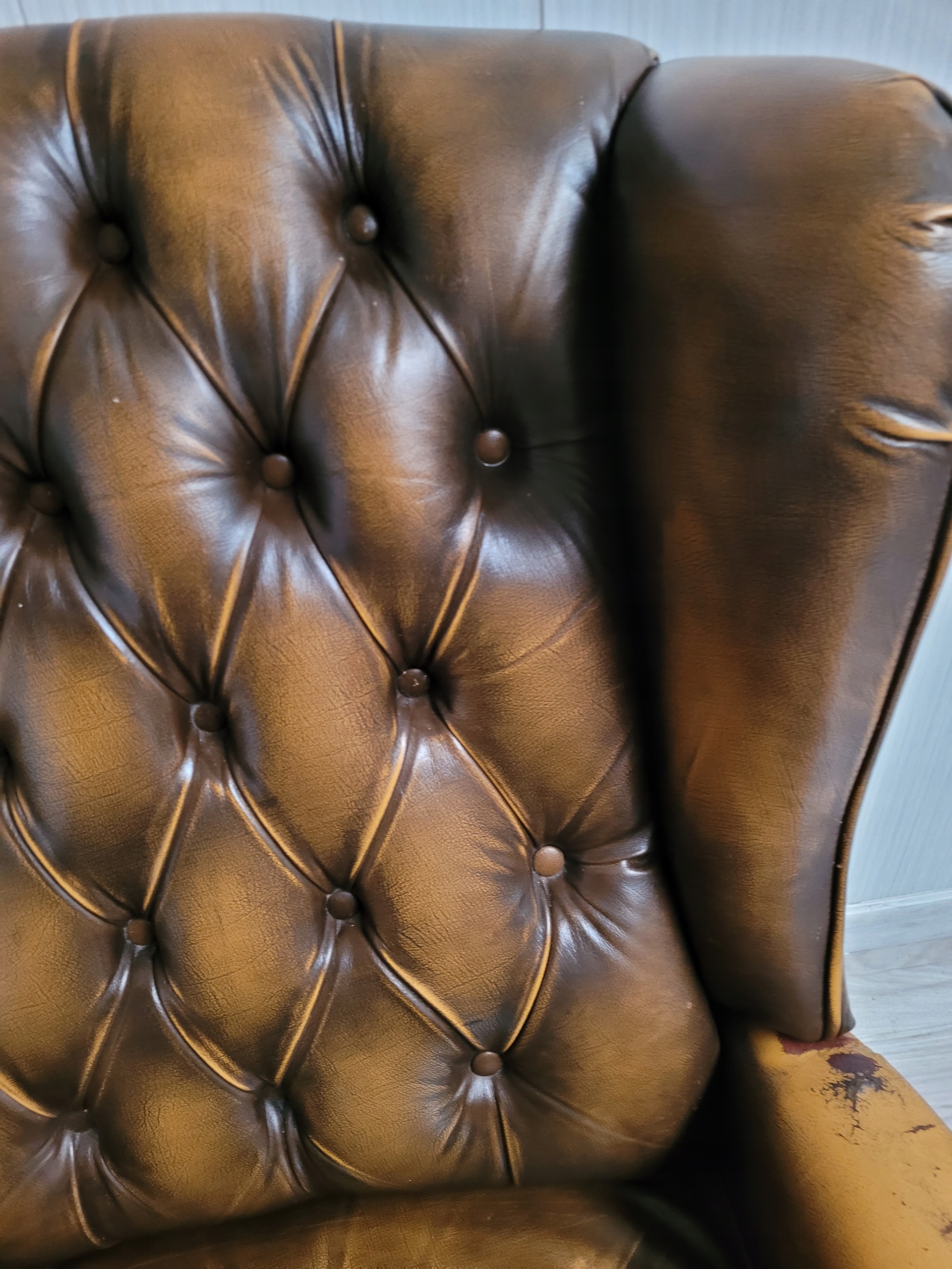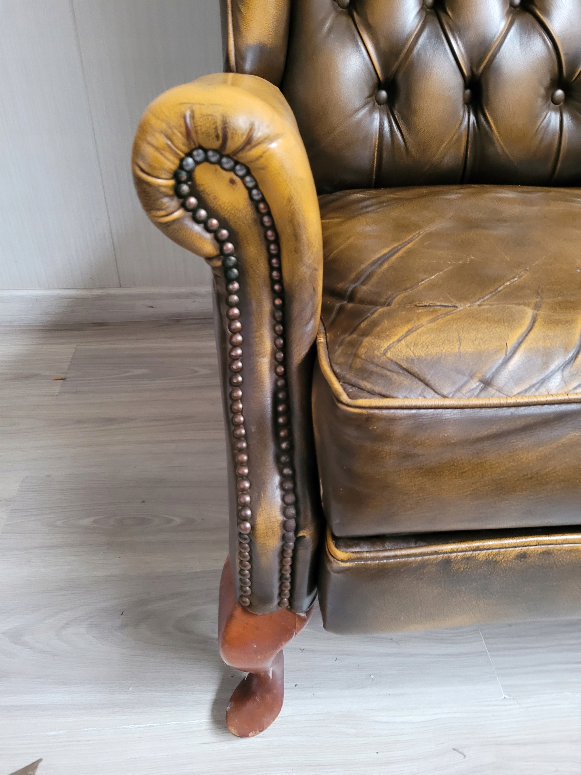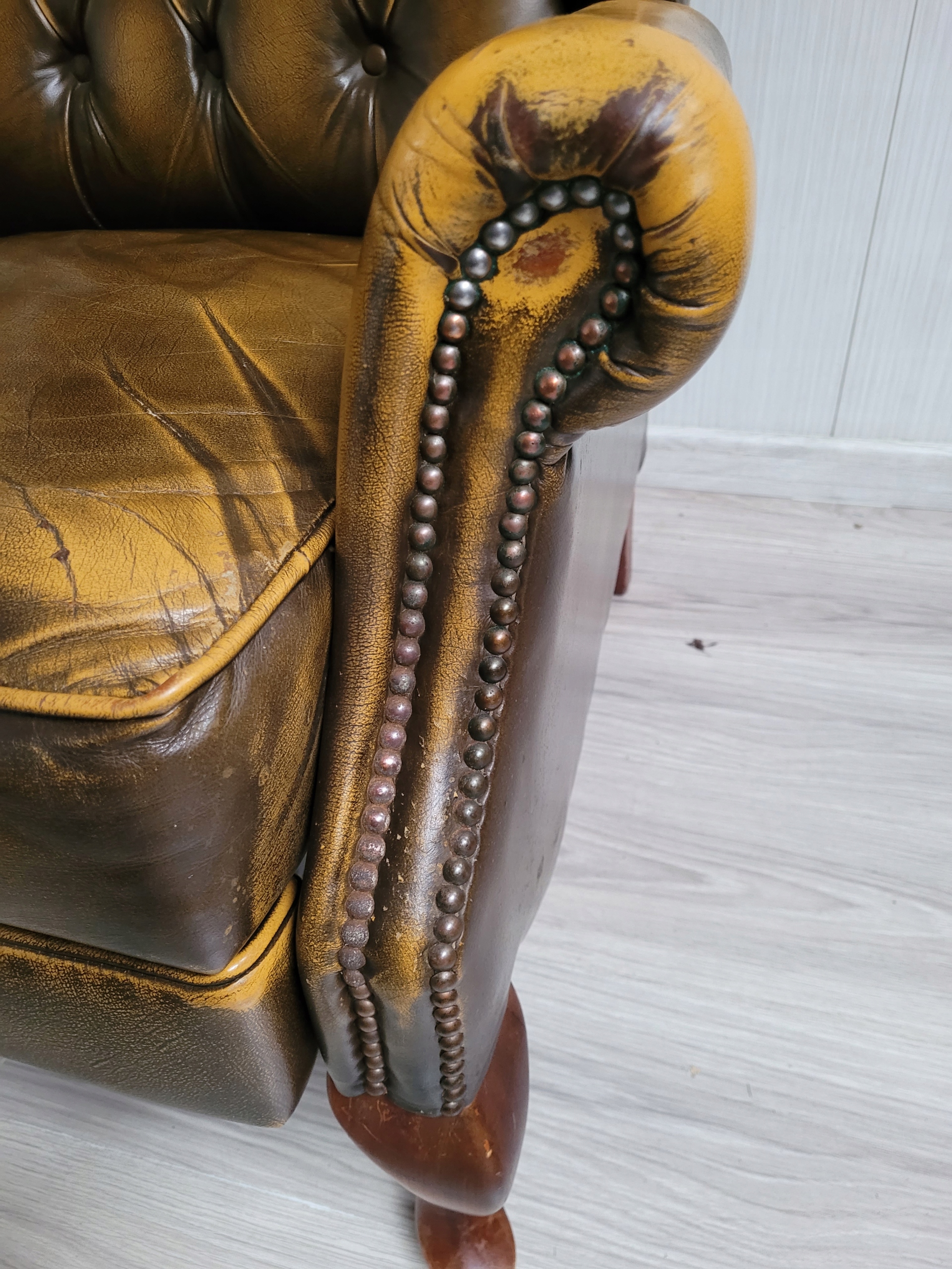 Stan dobry minus oparcie ładne bez roztargań, na siedzisku dziura, roztarganie i podłokietniki też uszkodzone, nalot na pinezkach w dolnej części podłokietników.