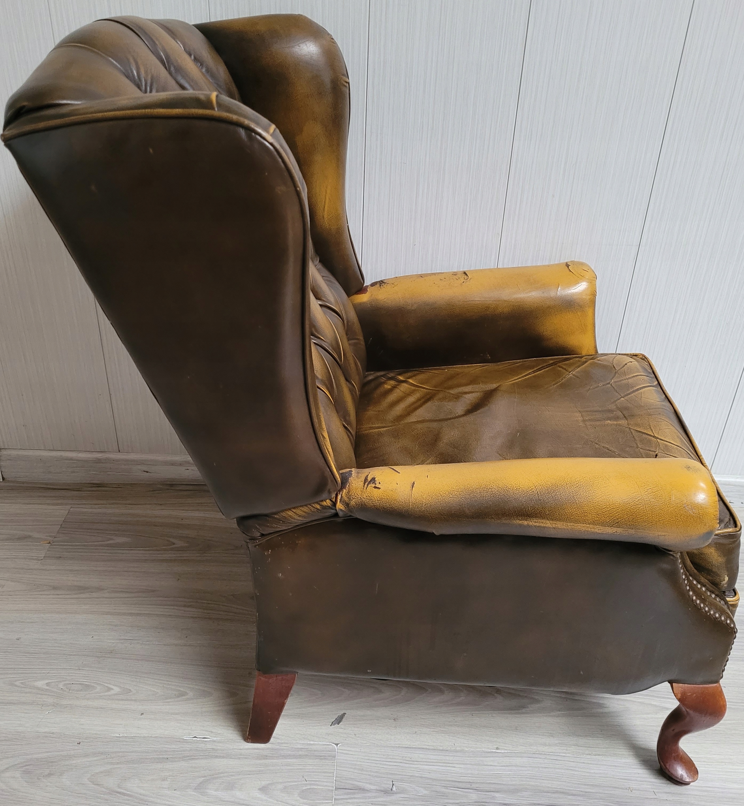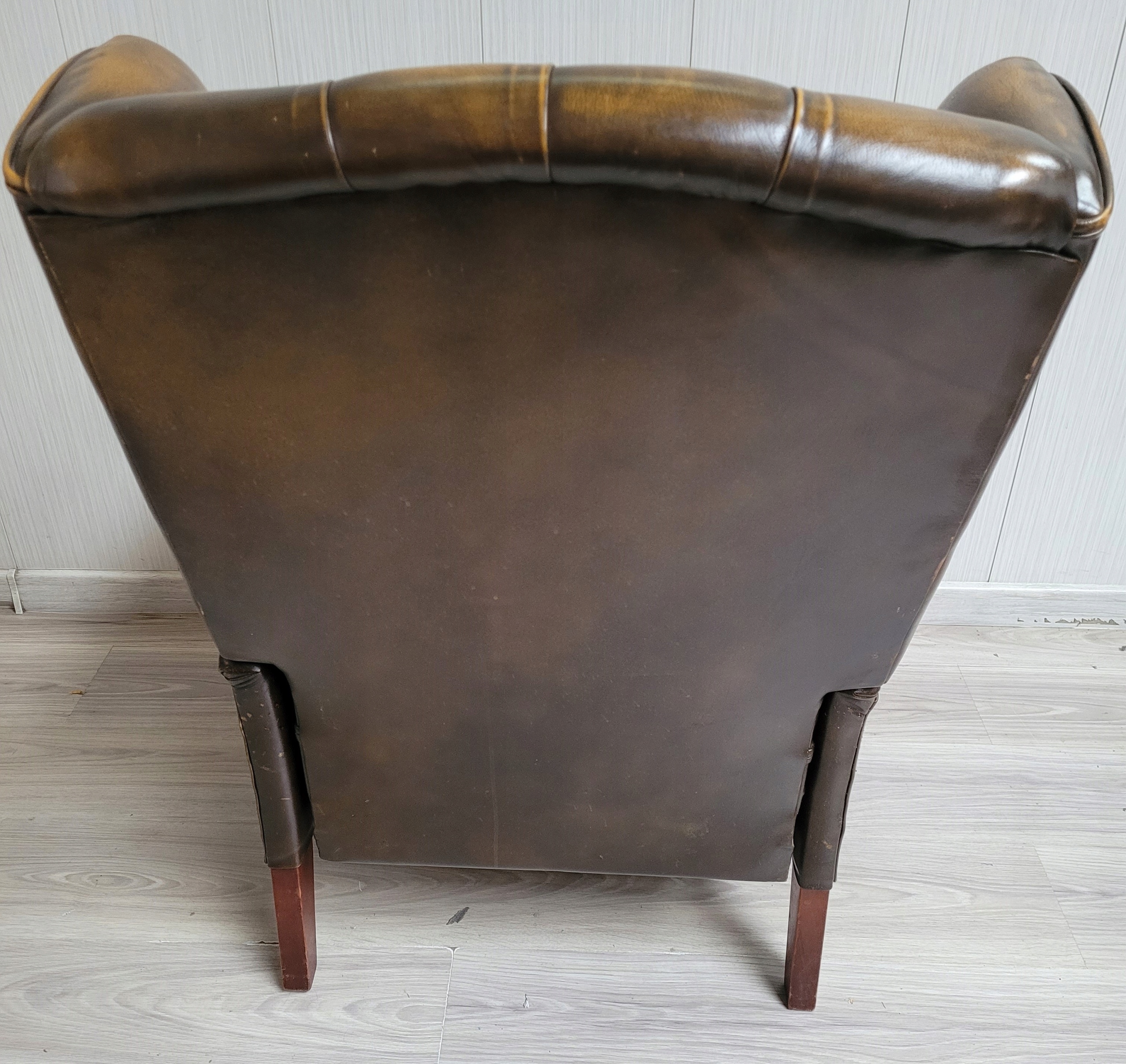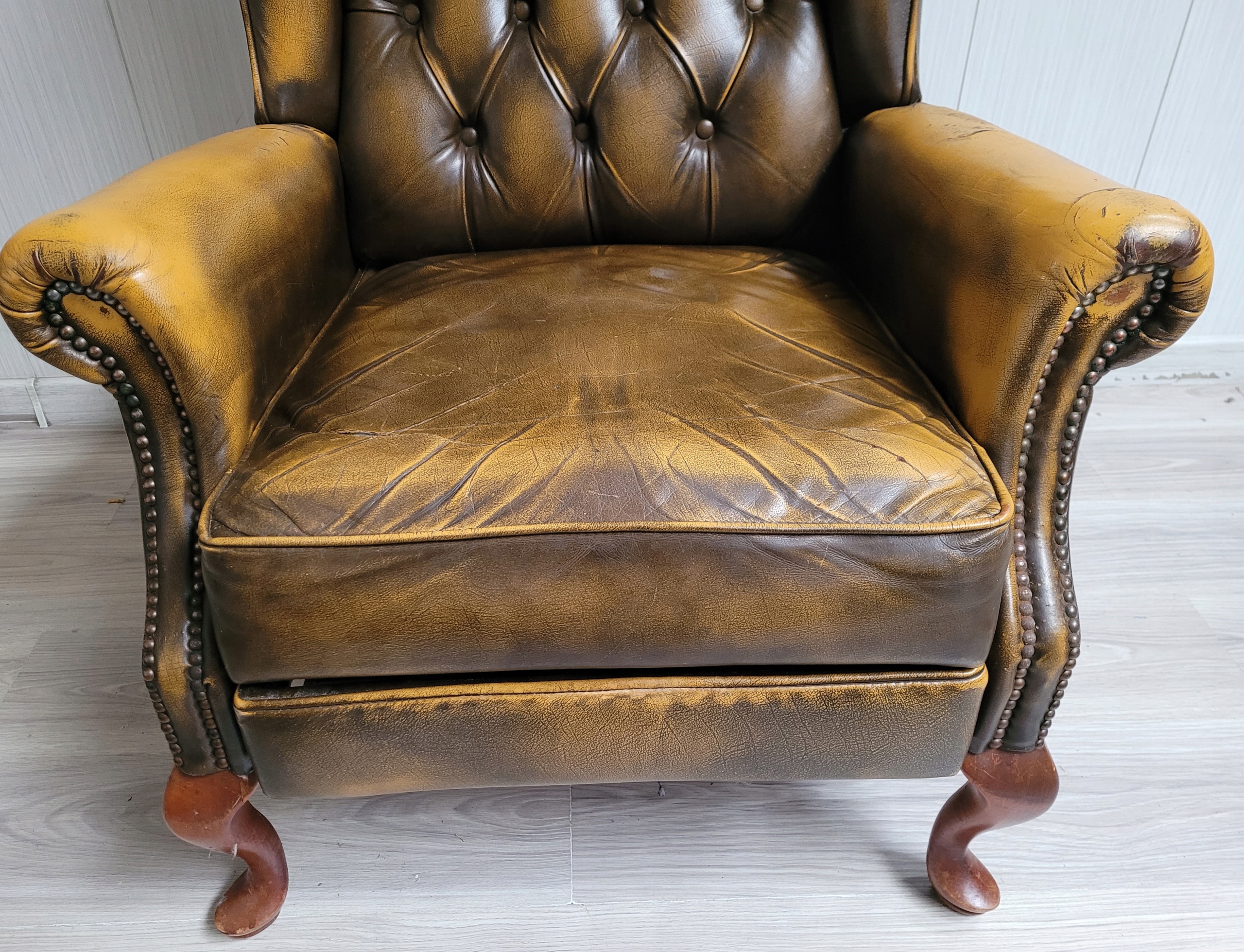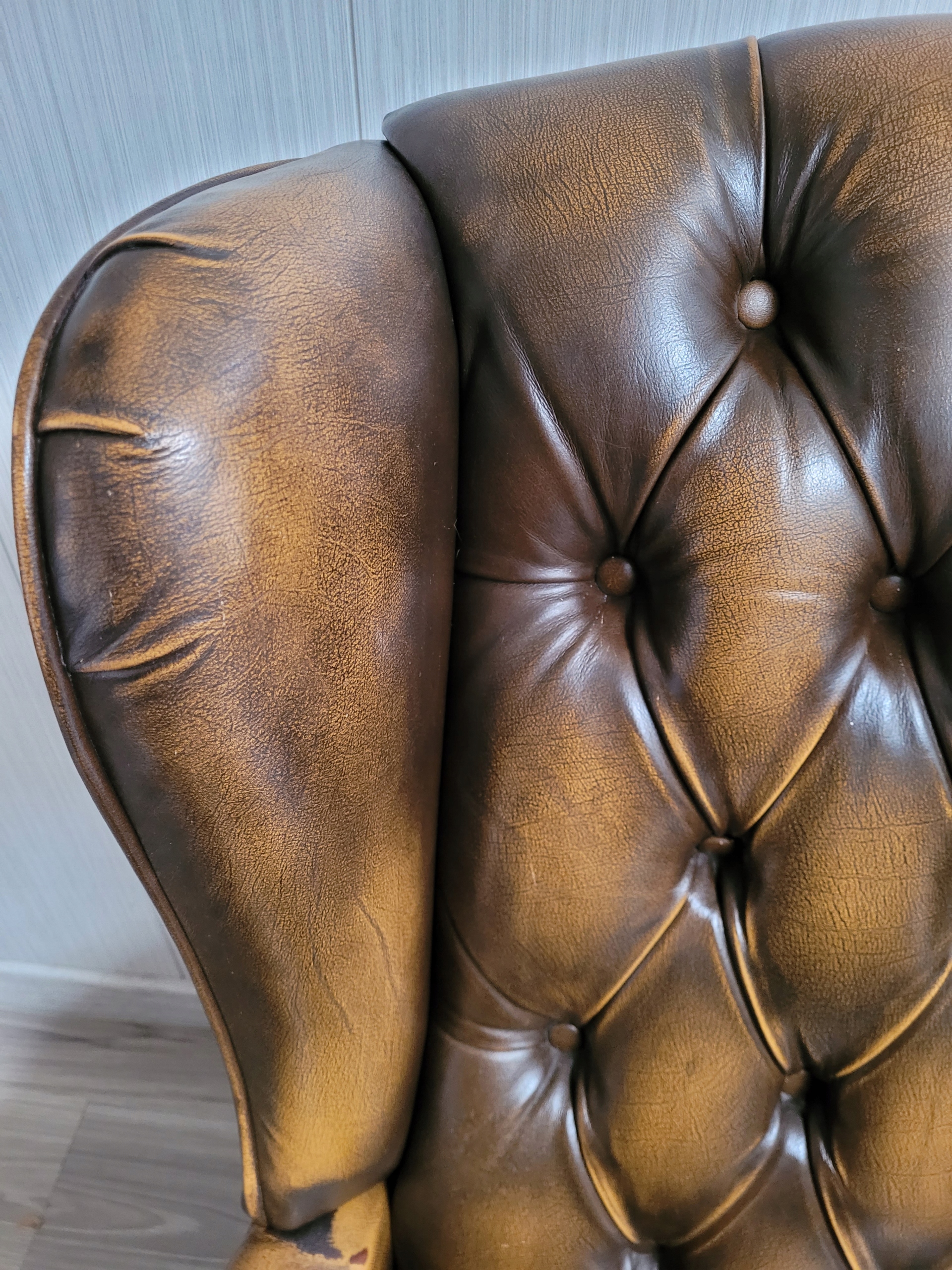 Stan dobry minus oparcie ładne bez roztargań, na siedzisku dziura, roztarganie i podłokietniki też uszkodzone, nalot na pinezkach w dolnej części podłokietników.
