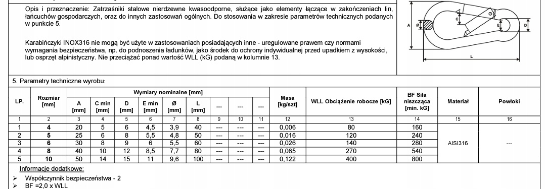 Karabinek do Lin Strażacki Karabińczyk nierdzewny 6x60mm INOX to wysokiej jakości element łączący, wykonany z trwałej i odpornej na korozję stali nierdzewnej AISI316. Dzięki swoim właściwościom kwasoodpornym, karabinek jest idealnym wyborem do zastosowań w trudnych warunkach atmosferycznych oraz środowiskach o wysokiej wilgotności. Jego solidna konstrukcja zapewnia niezawodność i bezpieczeństwo w różnych zastosowaniach.