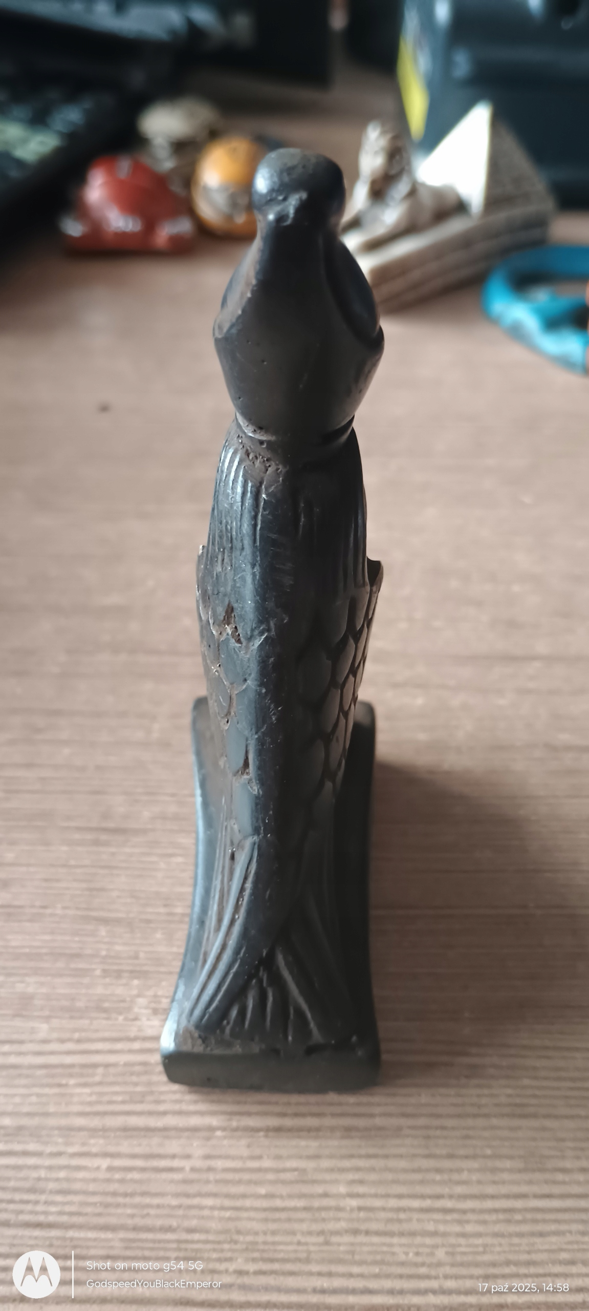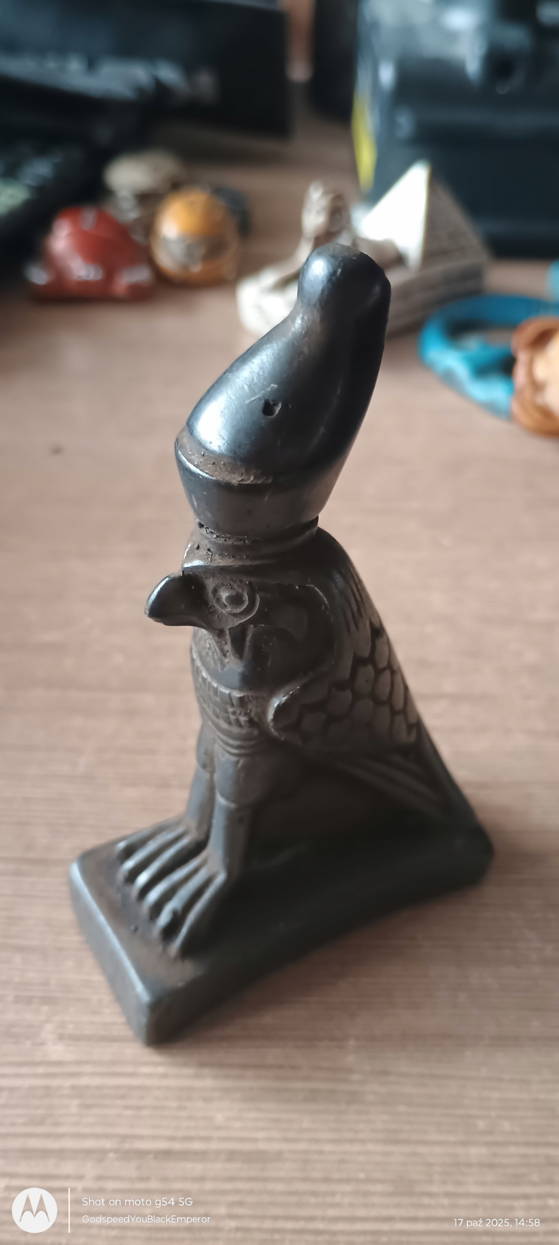 Nowa, efektowna figura boga Horusa, przywieziona z Egiptu, wysokość 5 cm, robiąca wrażenie, niska cena, idealna na przycisk do papierów w kancelarii adwokackiej.