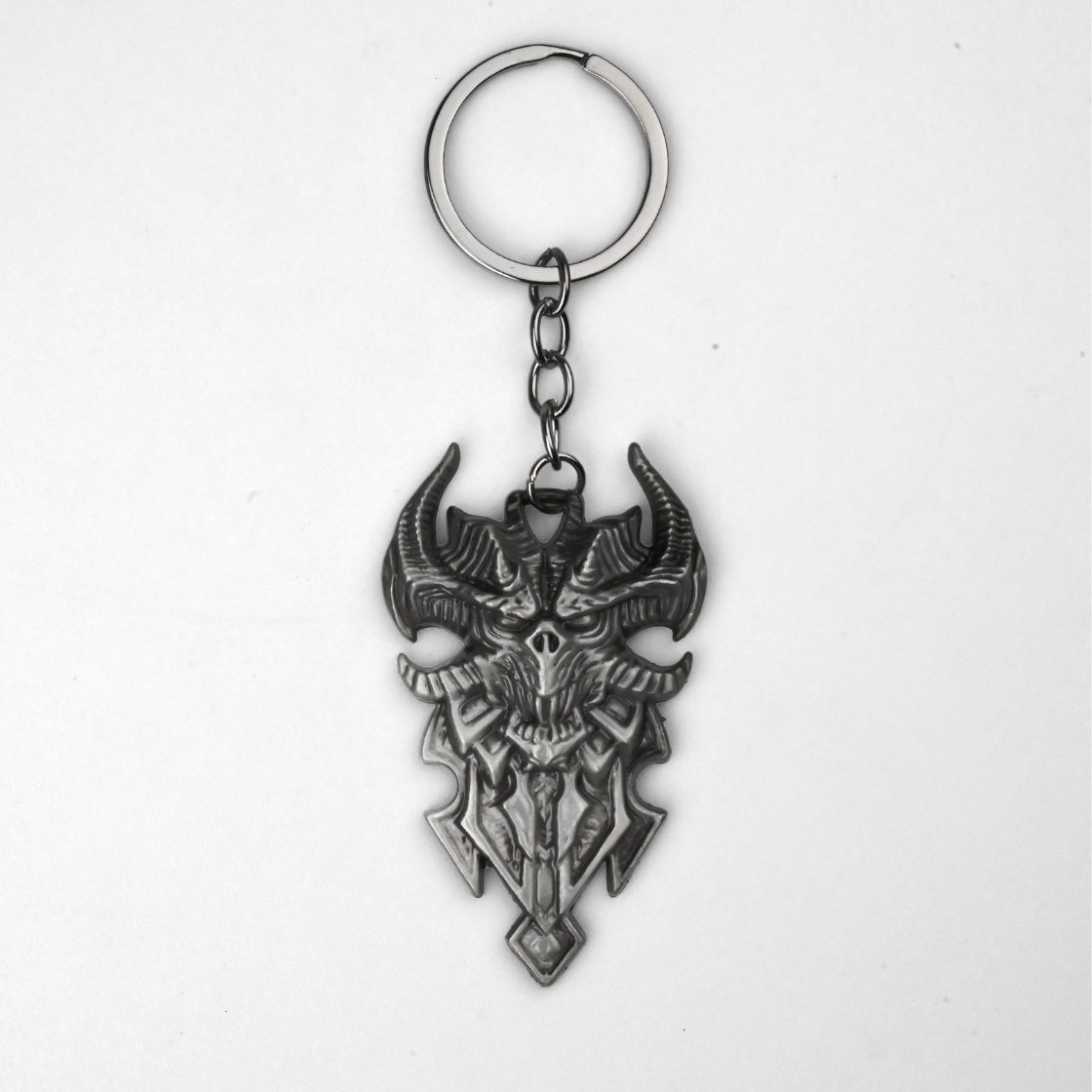 Od miasteczek Sanktuarium po samo wejście do Płonących Piekieł – Demon pozwala zabrać ze sobą odrobinę diablowskiego mroku gdziekolwiek nosisz klucze. Zawieszka przedstawia rogaty, czaszkowy herb w pionie, wyrzeźbiony w wyraźnym reliefie: poszarpane kości policzkowe, żłobione rogi i warstwowe „płytki” schodzące do diamentowego szpica. Kolor to ciemny gunmetal z satynowymi refleksami i grafitową patyną w zagłębieniach, co daje efekt kutej stali. Puste przestrzenie w oczach i między rogami podkreślają sylwetkę, a gładka krawędź domyka całość. Dołączony jest solidny kółek-split z krótkim łańcuszkiem. Na rewersie znajdują się wypukłe logotypy „DIABLO” i „BLIZZARD ENTERTAINMENT”, czyli elegancki backstamp potwierdzający markę. Metalowa konstrukcja i format 5 cm dają przyjemny ciężar i trwałość – idealnie do plecaka, smyczy, paska cosplayowego albo po prostu do kluczy. Rzeźba nawiązuje do growej ikonografii Najwyższych Złych i świetnie uzupełni każdą półkę fana, a jednocześnie jest na tyle kompaktowa, by towarzyszyć na co dzień. Gotowy do przypięcia, pokazania i podarowania.