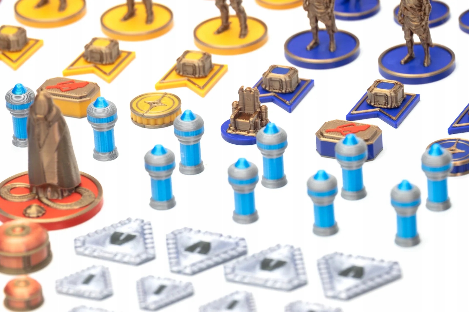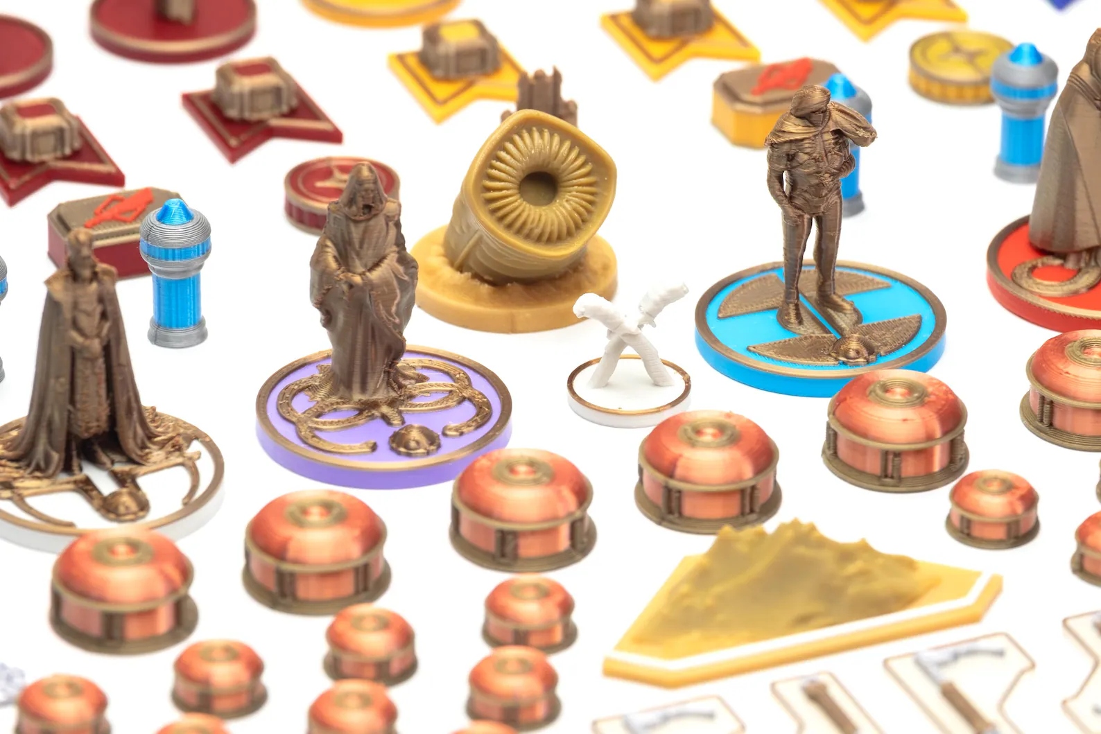 Elementy graczy wykonano w kontrastowych, dobrze rozróżnialnych kolorach, zachowując przy tym klimat świata Diuny. Żetony i figurki są zarówno funkcjonalne, jak i estetyczne, ułatwiają orientację na planszy i wciągają jeszcze bardziej w rozgrywkę.