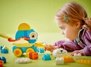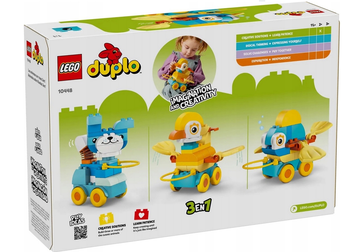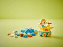 Pobudź kreatywność maluchów dzięki zestawowi 3 w 1 Zwierzątka na kółkach (10448). Mali miłośnicy zwierząt znajdą niezliczone sposoby na kreatywną zabawę, budując kaczkę, rybę lub pieska, a nawet tworząc zupełnie nowe zwierzaki. Dzieci w wieku przedszkolnym, które uwielbiają zabawki LEGO® DUPLO®, zbudują swoje figurki na podstawie z kółkami, dzięki czemu będą mogły popychać modele lub ciągnąć je za uchwyt. Zestaw zawiera ruchome elementy, takie jak elastyczny ogon i zawiasy, które spodobają się maluchom, a jednocześnie rozwiną ich koordynację wzrokowo-ruchową. Dzieci wykorzystają umiejętność koncentracji, wytrwałość i wyobraźnię, bez końca budując i przebudowując swoje kreatywne zwierzaki. Zestaw idealnie nadaje się na prezent. Ta zabawka daje wiele okazji do nauki. Ten zestaw LEGO DUPLO 3 w 1 zawiera łatwe w układaniu klocki, które łatwo rozdzielić, dzięki czemu maluchy mogą z łatwością nauczyć się, jak zachować równowagę modelu na kołach, aby się nie przewrócił. Zestaw zawiera 58 elementów.