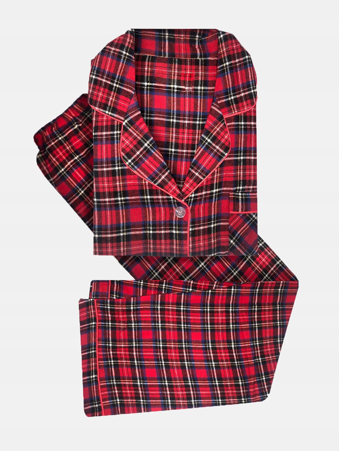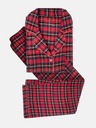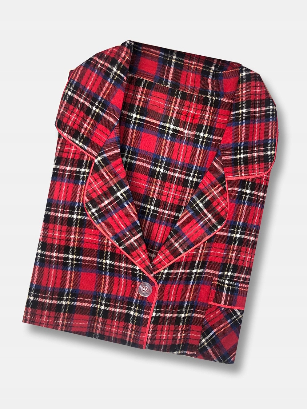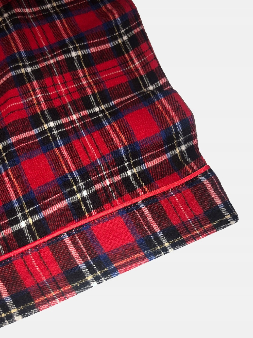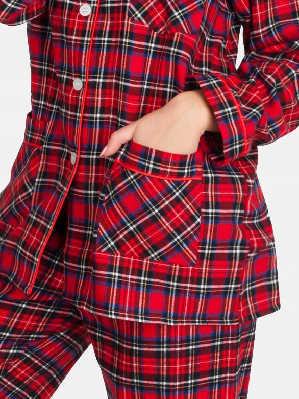 Piżama nie krępuje ruchów i zapewnia komfort spania. Luźna rozpinana koszulka z długim rękawem i kołnierzem. Dekolt w serek/dekolt V. Kieszeń na piersi oraz dwie kieszenie w dolnej części koszuli. Rękawy, nogawki oraz kołnierz wykończone elegancką, grubą lamówką. Luźne, długie spodnie - kratka. W pasie nieuciskająca, elastyczna guma w tunelu.