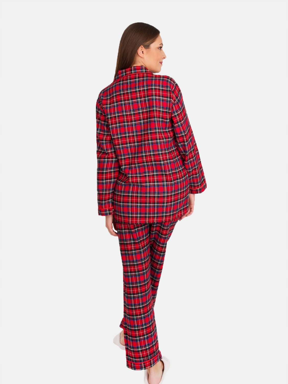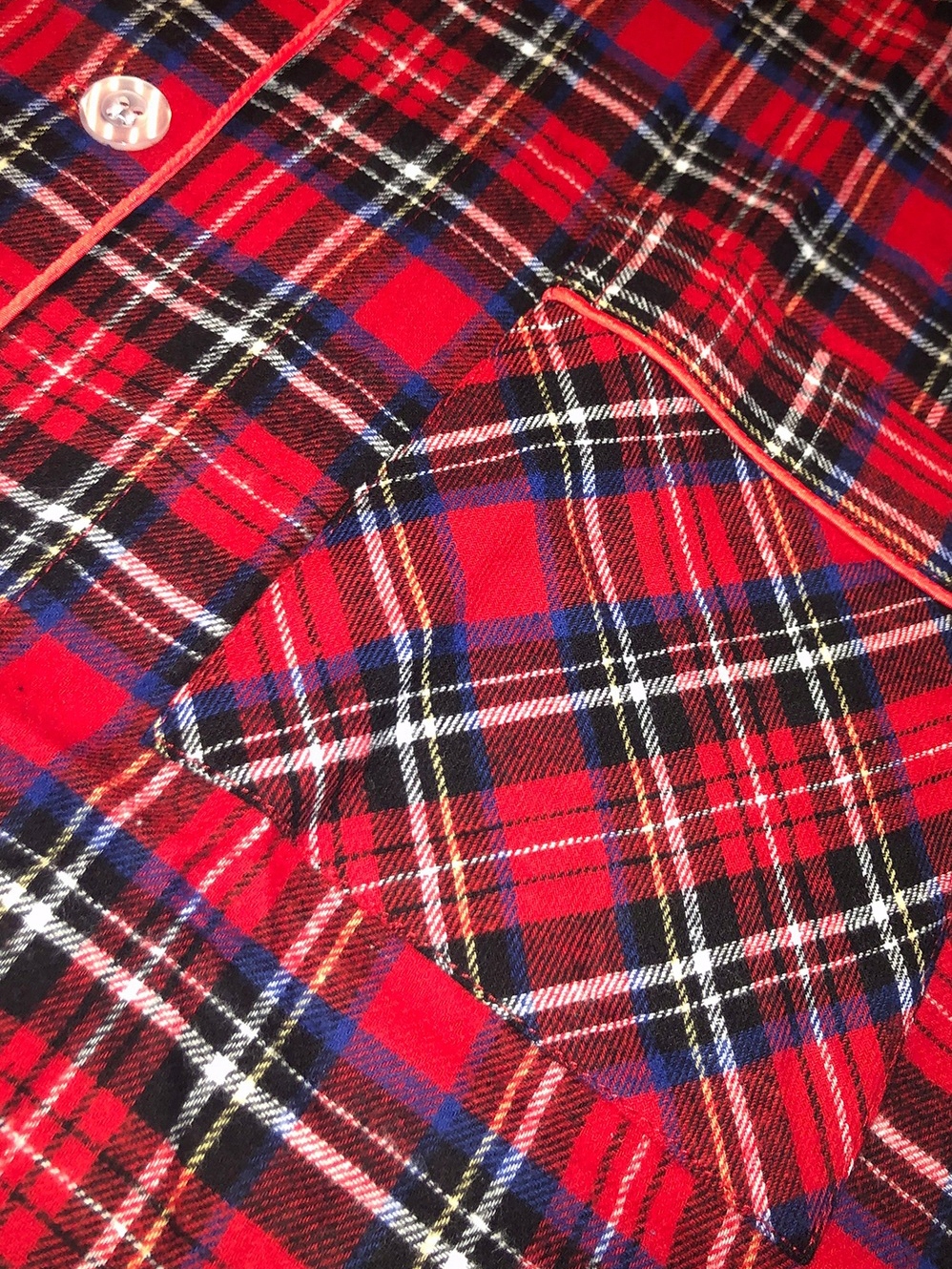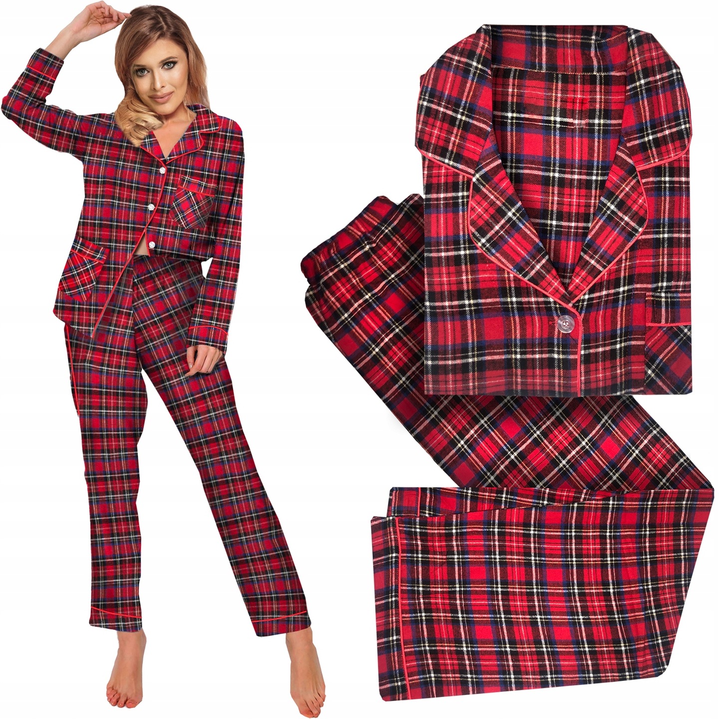 Piżama nie krępuje ruchów i zapewnia komfort spania. Luźna rozpinana koszulka z długim rękawem i kołnierzem. Dekolt w serek/dekolt V. Kieszeń na piersi oraz dwie kieszenie w dolnej części koszuli. Rękawy, nogawki oraz kołnierz wykończone elegancką, grubą lamówką. Luźne, długie spodnie - kratka. W pasie nieuciskająca, elastyczna guma w tunelu.