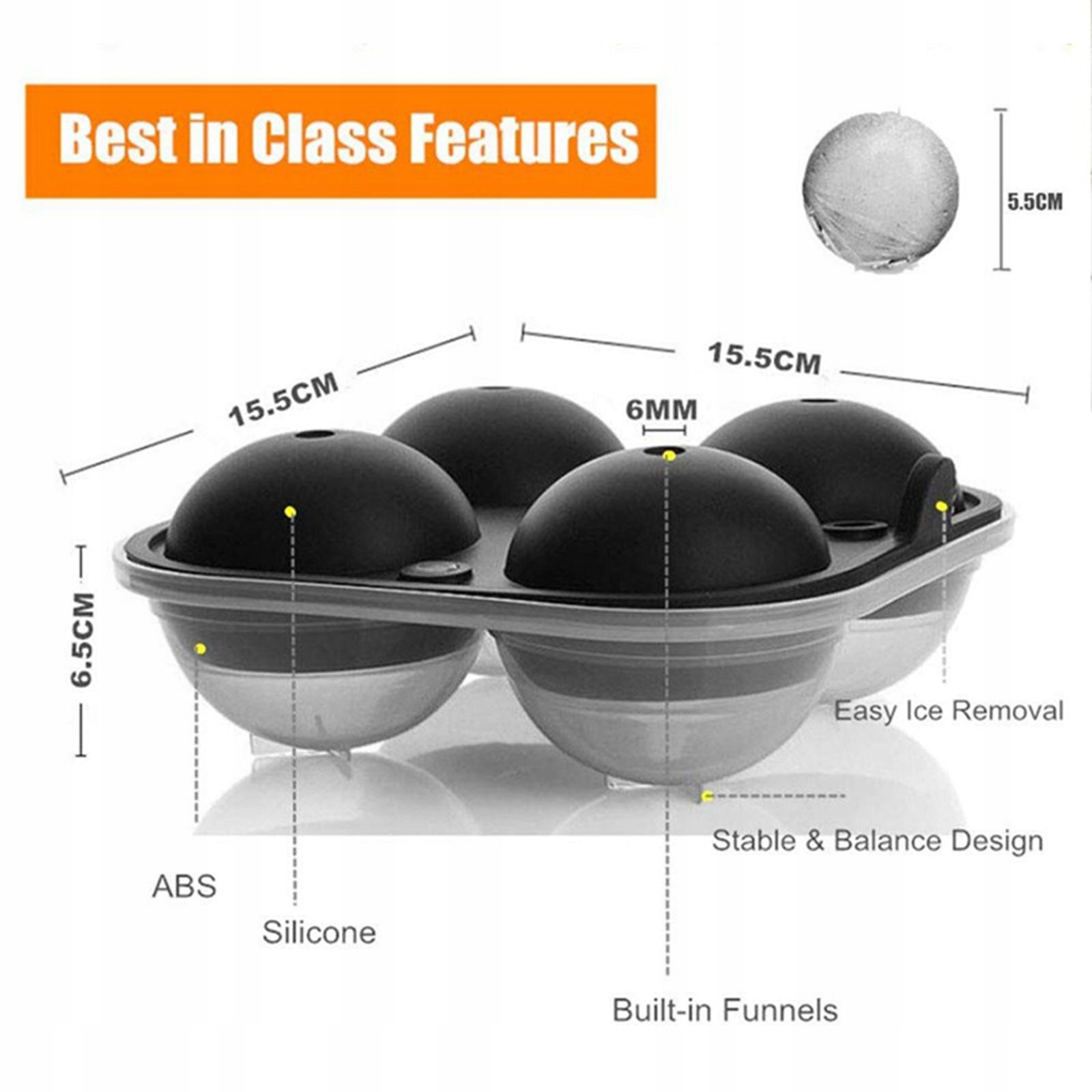 Wykonywanie 5.5 cm dużych kulek lodowych: średnica każdej wnęki wynosi 2.17 cala, taca formy do kulek lodowych wynosi 15.5 cmx15.5 cmx6.5 cm/6.10 calax6.10 calax2.56 cala. Ma to na celu wykonanie 4 dużych sfer lodowych na raz.