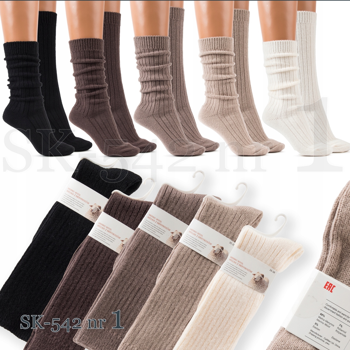 Skład: 88% wełna merynosów, 7% poliamid, 5% elastanZestaw: 5 par w modnych kolorach – kremowym, beżowym, brązowym, czekoladowym i czarnym