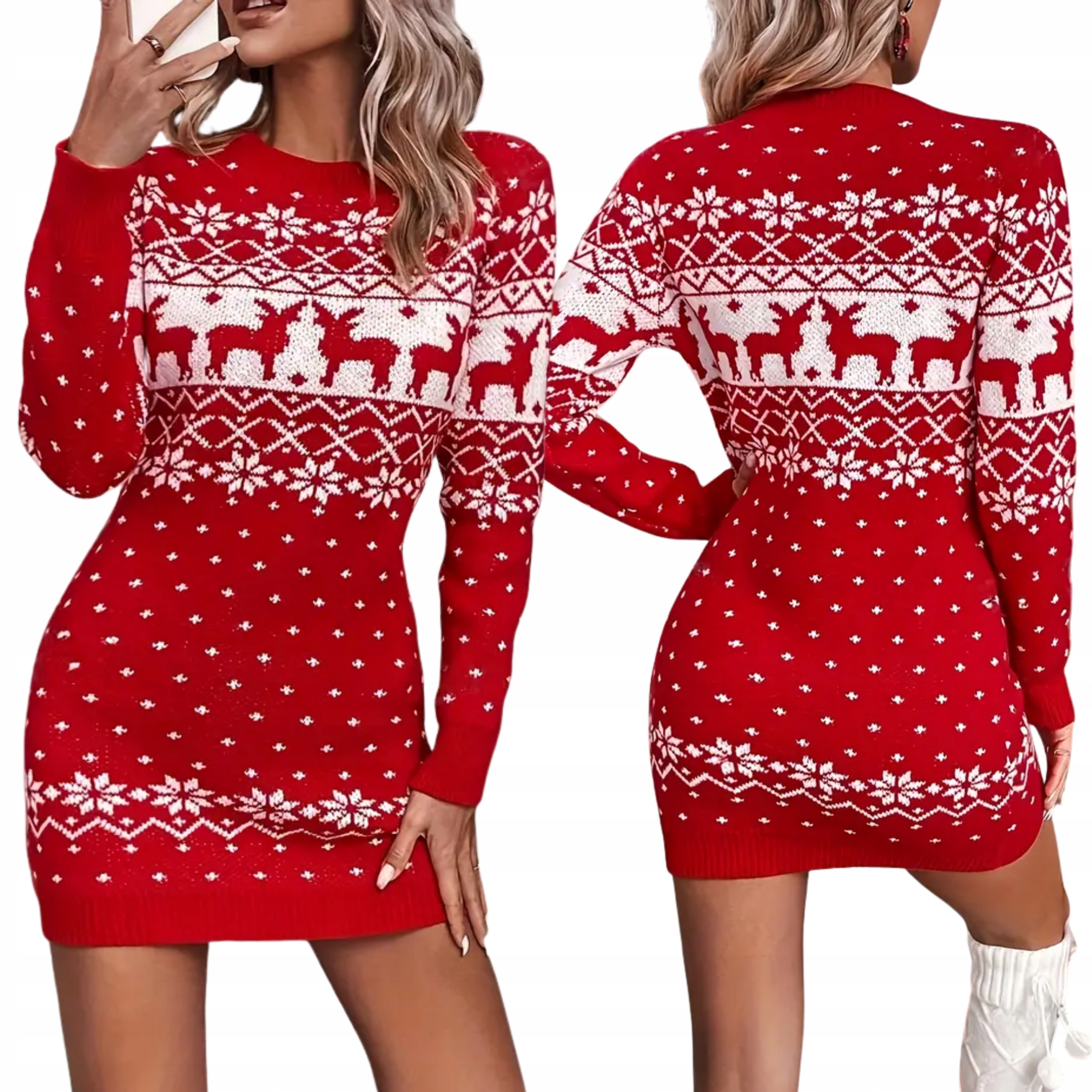Podaruj sobie odrobinę świątecznego ciepła i kobiecego stylu z naszą świąteczną sukienką sweterkową, która otuli Cię komfortem w każdej zimowej chwili. Wykonana z miękkiej, elastycznej dzianiny, zapewnia wygodę przez cały dzień, a uroczy, zimowy wzór wprowadzi do Twojej garderoby magię Bożego Narodzenia.