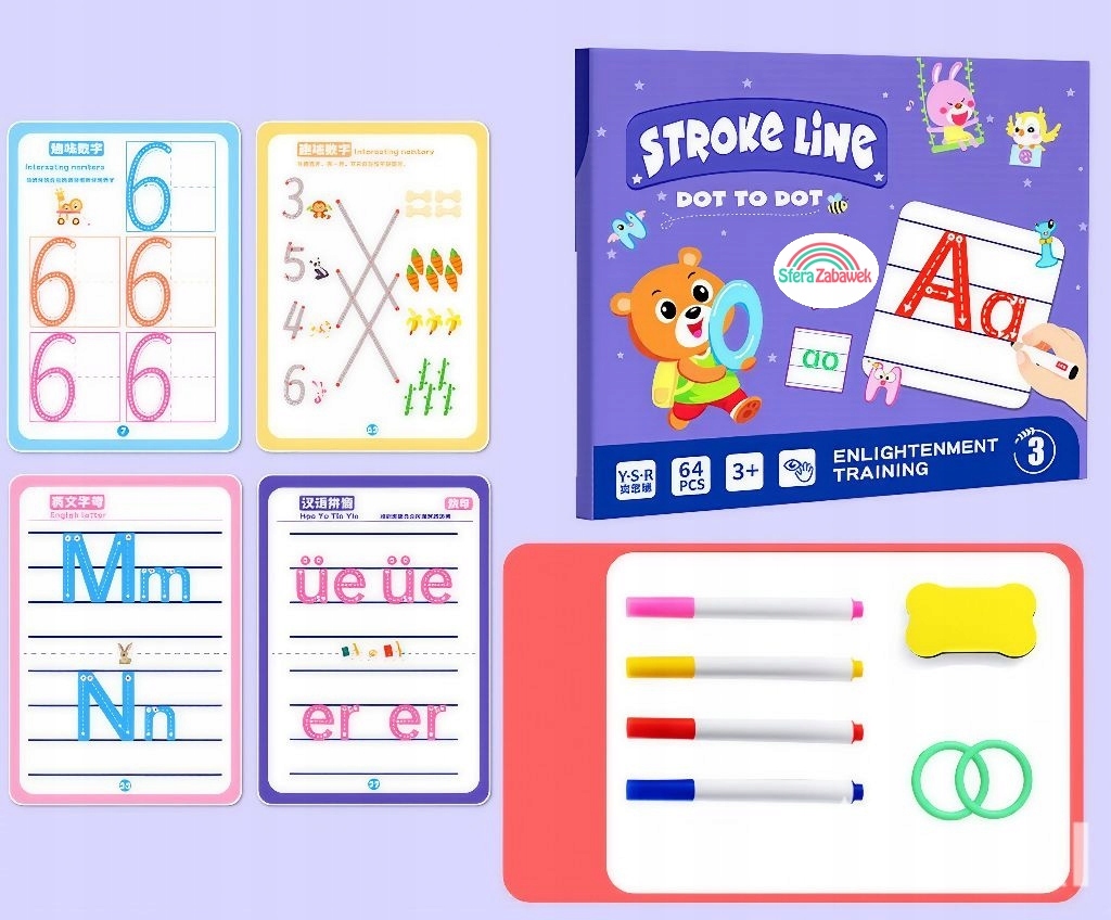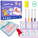 💡 Nasz zestaw „Stroke Line” to zmazywalna książeczka i karty, po których maluch może pisać do woli załączonymi markerami, a potem zetrzeć wszystko gąbeczką i zacząć od nowa.