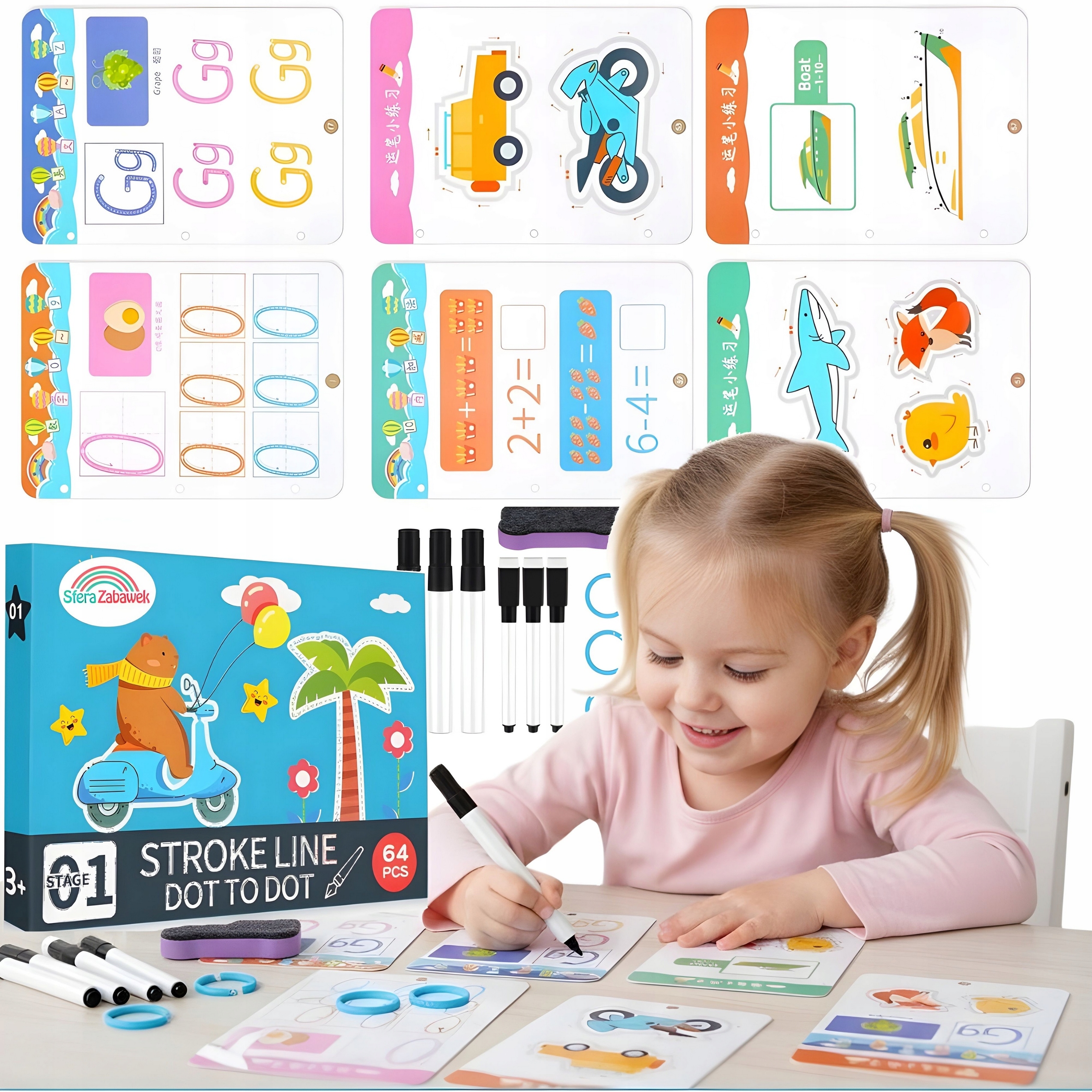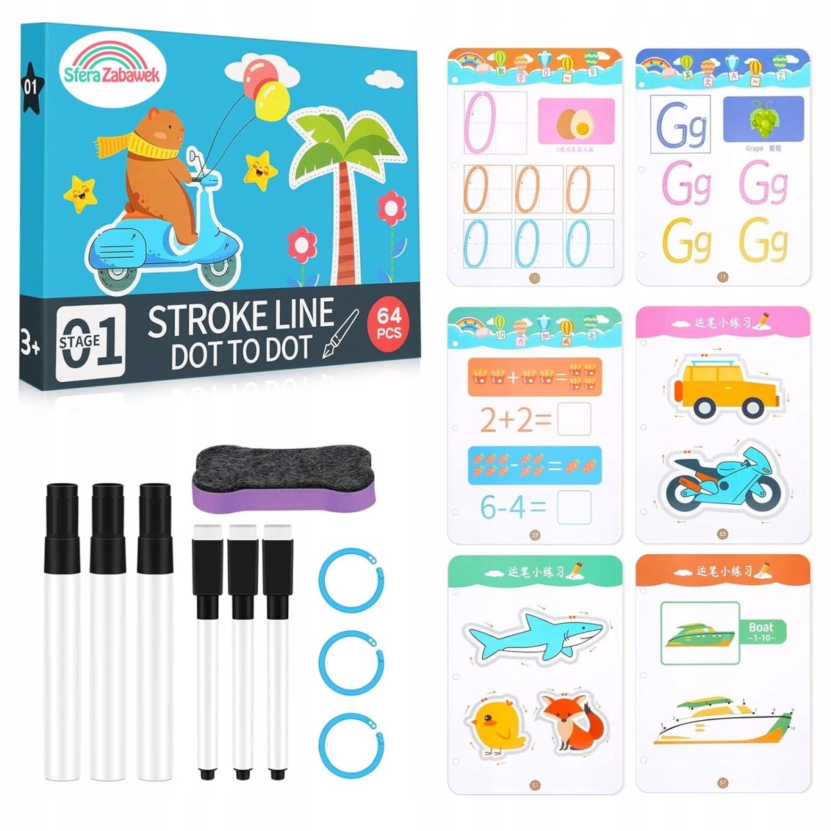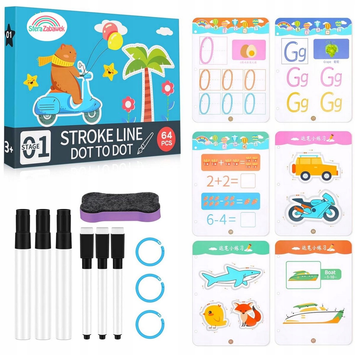 Zestaw składa się z 64 stron (32 dwustronne, sztywne karty) pełnych angażujących ćwiczeń – od nauki pisania literek i cyferek, przez proste zadania matematyczne, aż po rysowanie i łączenie kropek. 🧠💡