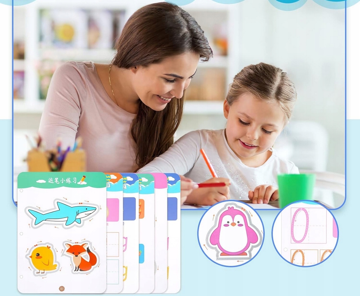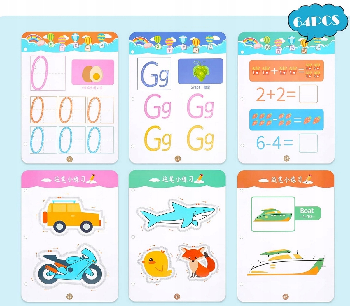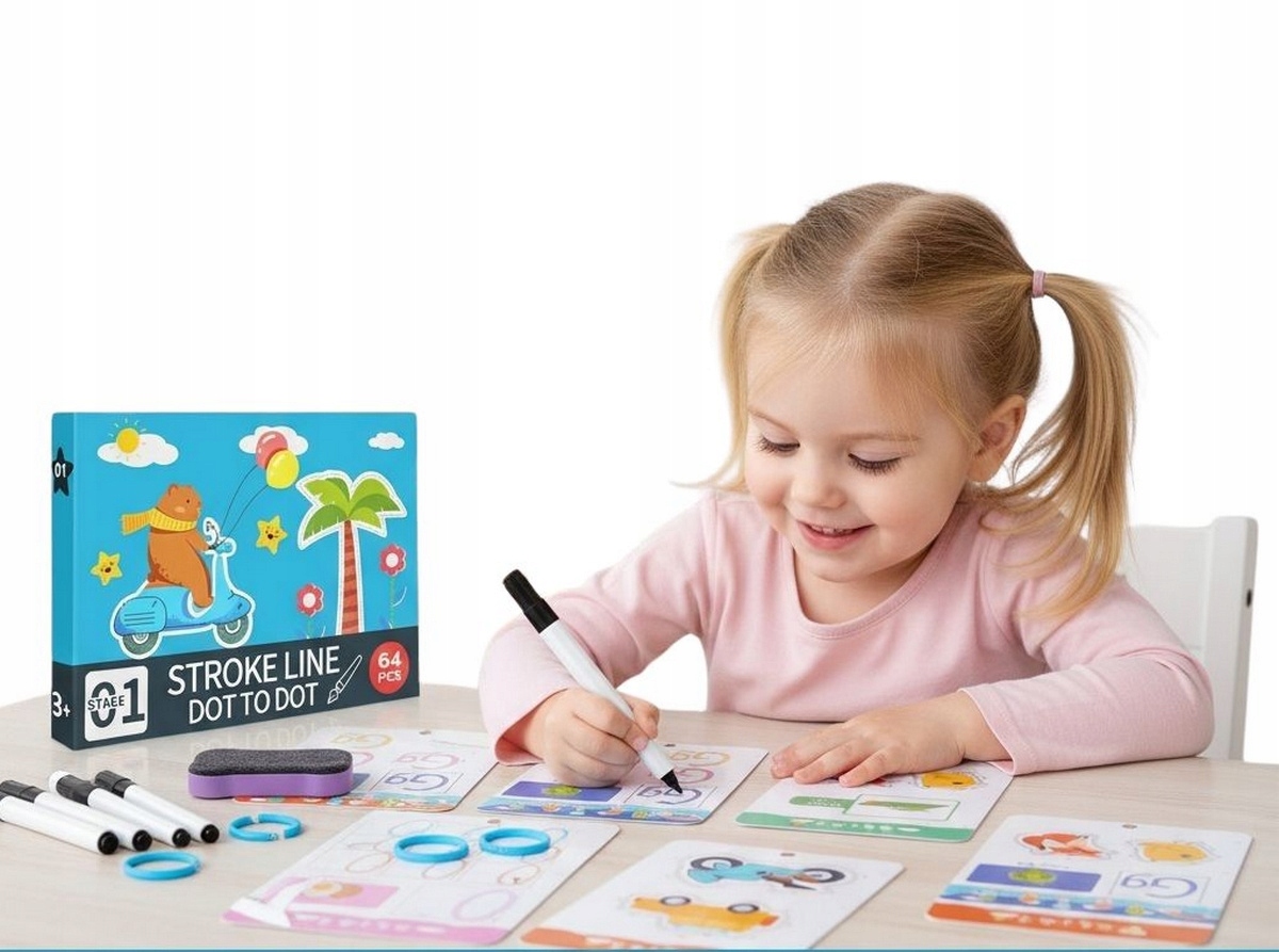 Zestaw składa się z 64 stron (32 dwustronne, sztywne karty) pełnych angażujących ćwiczeń – od nauki pisania literek i cyferek, przez proste zadania matematyczne, aż po rysowanie i łączenie kropek. 🧠💡