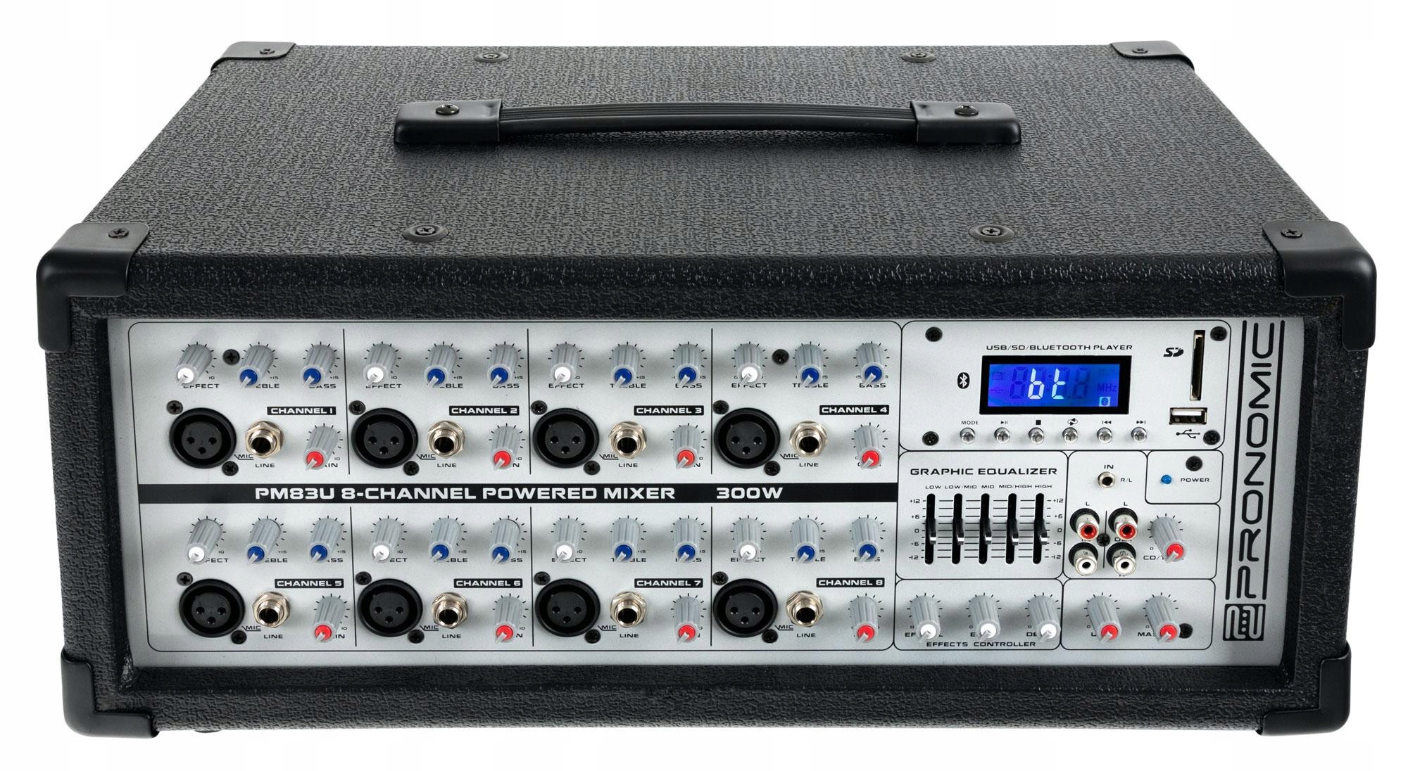 Pronomic PM83U MP3 to inteligentny powermix, który ma 8 kanałów, każdy ze złączem Jack 6,3 i XLR i może być używany zarówno w sali prób, jak i podczas gry na żywo. Każdy kanał ma skuteczny 2-pasmowy korektor i suwak pro. Główne wyjście ma 5-pasmowy korektor graficzny z zakresem sterowania od -12dB do + 12dB. Tutaj ogólny sygnał może być skutecznie korygowany i kształtowany. Sekcja efektów ma Echo, Delay i kontrolę głośności. Możesz więc dostosować efekty do swoich osobistych i muzycznych potrzeb.