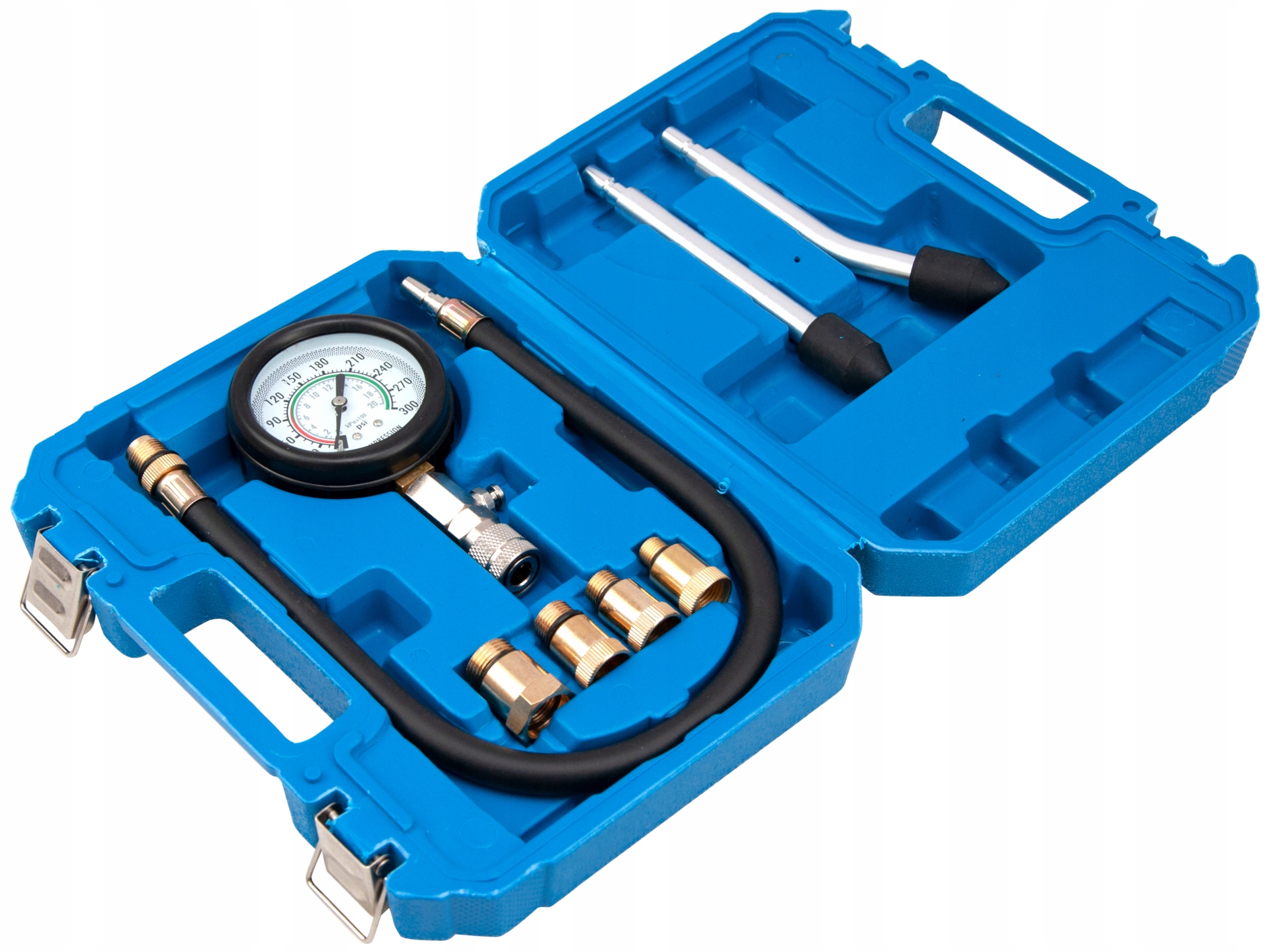 Tester do kontroli ciśnienia sprężania w cylindrach silników benzynowych z wyposażeniem poszerzającym jego możliwości. W walizce plastikowej znajduje się manometr z zaworem, przedłużka prosta i zagięta, przedłużający wąż ciśnieniowy oraz 4 adaptery do podłączenia do cylindrów. Części są wyposażone w szybkozłącza do łatwego i szybkiego zamontowania.