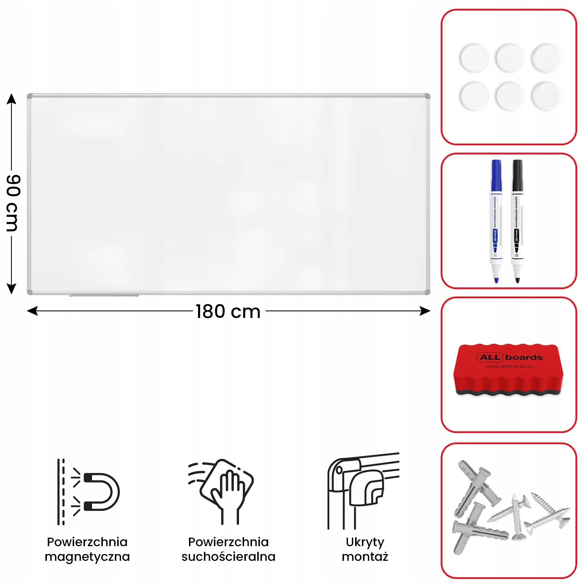Biała magnetyczna tablica ALLboards wykonana jest z sztywnej i wytrzymałej blachy, dzięki której tablica zyskuje właściwości magnetyczne. Blacha pokryta jest warstwą lakieru, który nadaje tablicy biały kolor oraz gładką i lśniącą powierzchnię. Dzięki zastosowaniu odpowiedniego lakieru, tablice można ścierać na sucho za pomocą dołączonej do zestawu gąbki lub papierowego ręcznika.