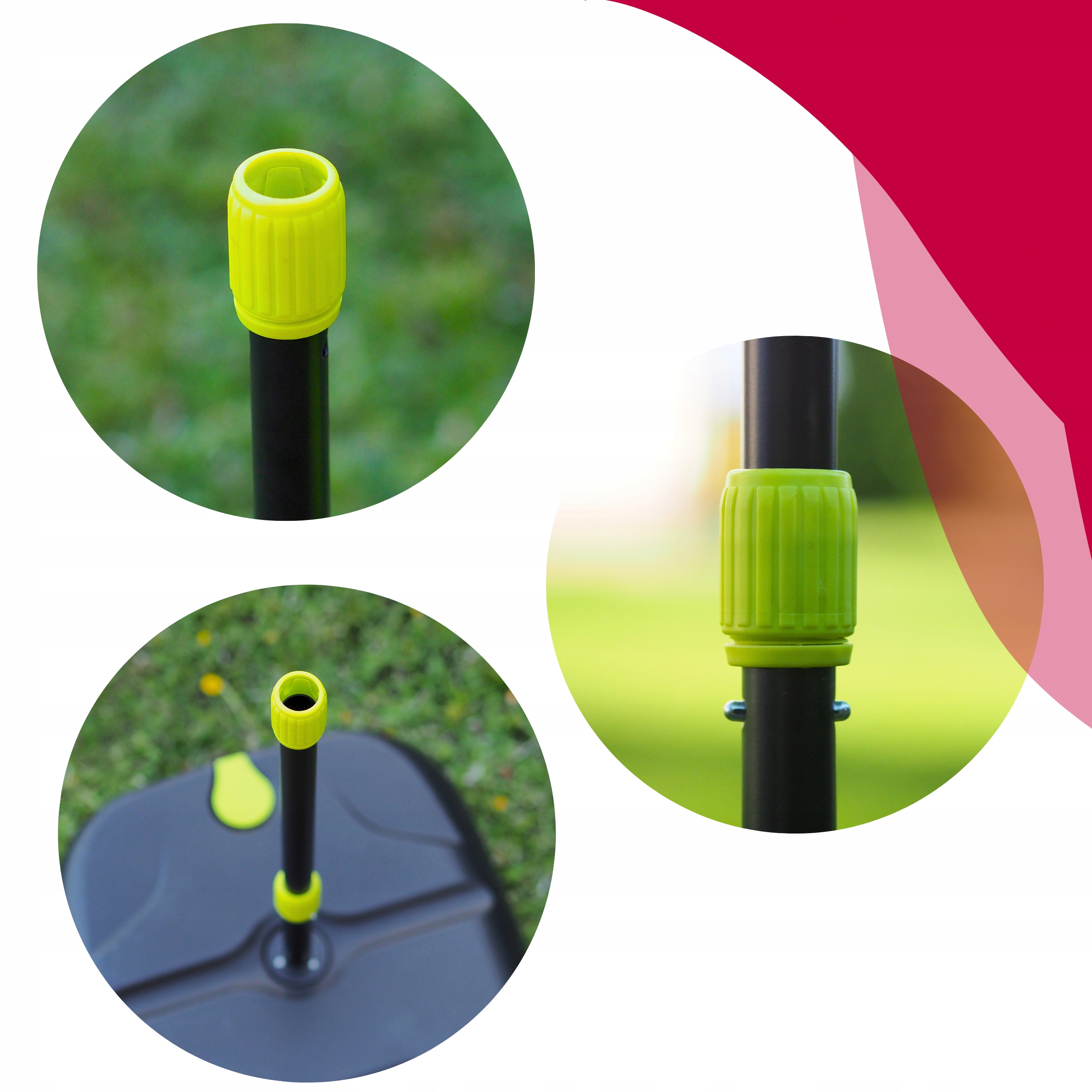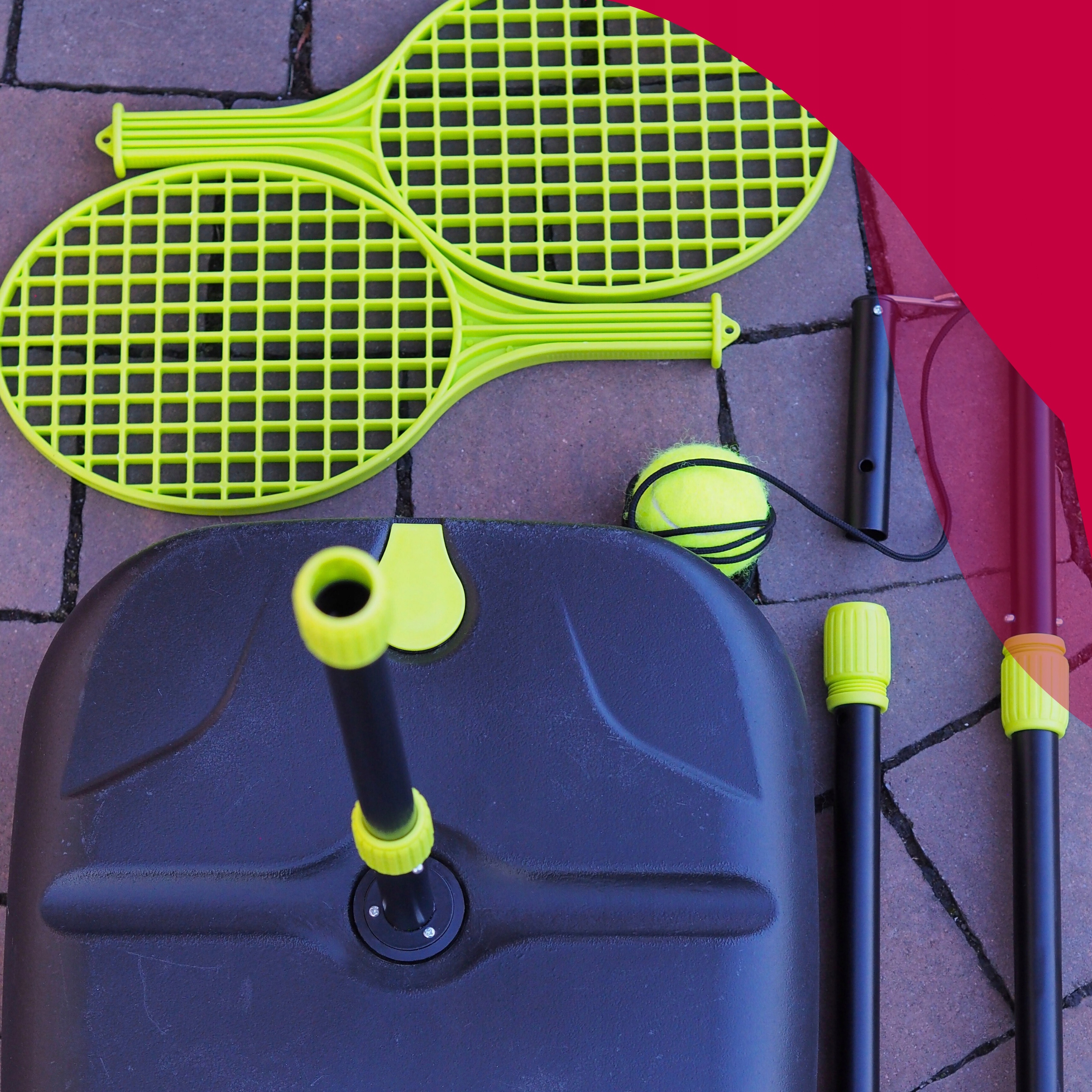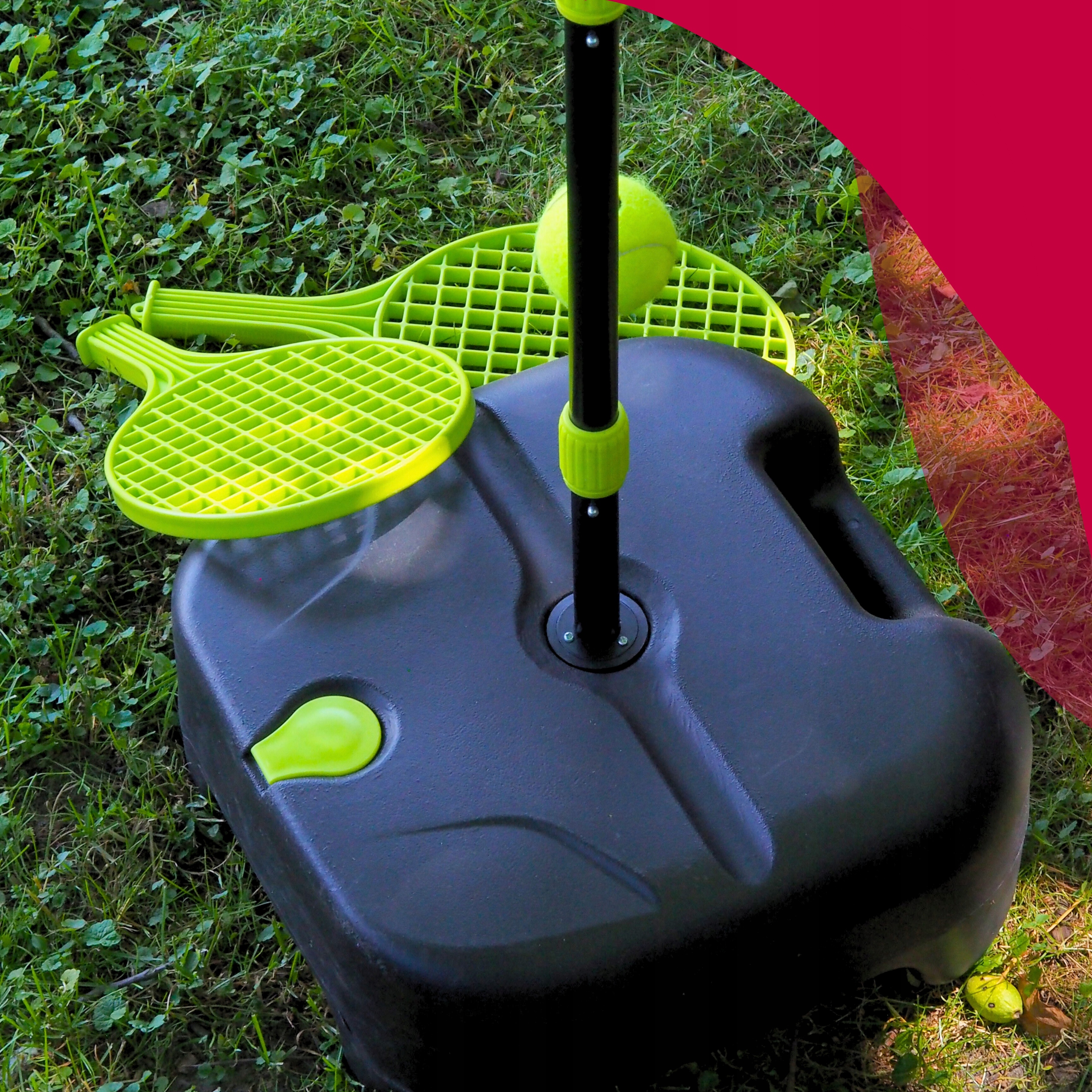 Aby zestaw był w pełni bezpieczny i stabilny podczas gry, podstawa została zaprojektowana tak, by można ją było wypełnić wodą lub piaskiem. Dzięki temu sprzęt pewnie trzyma się podłoża i nie przesuwa się nawet podczas dynamicznej zabawy.