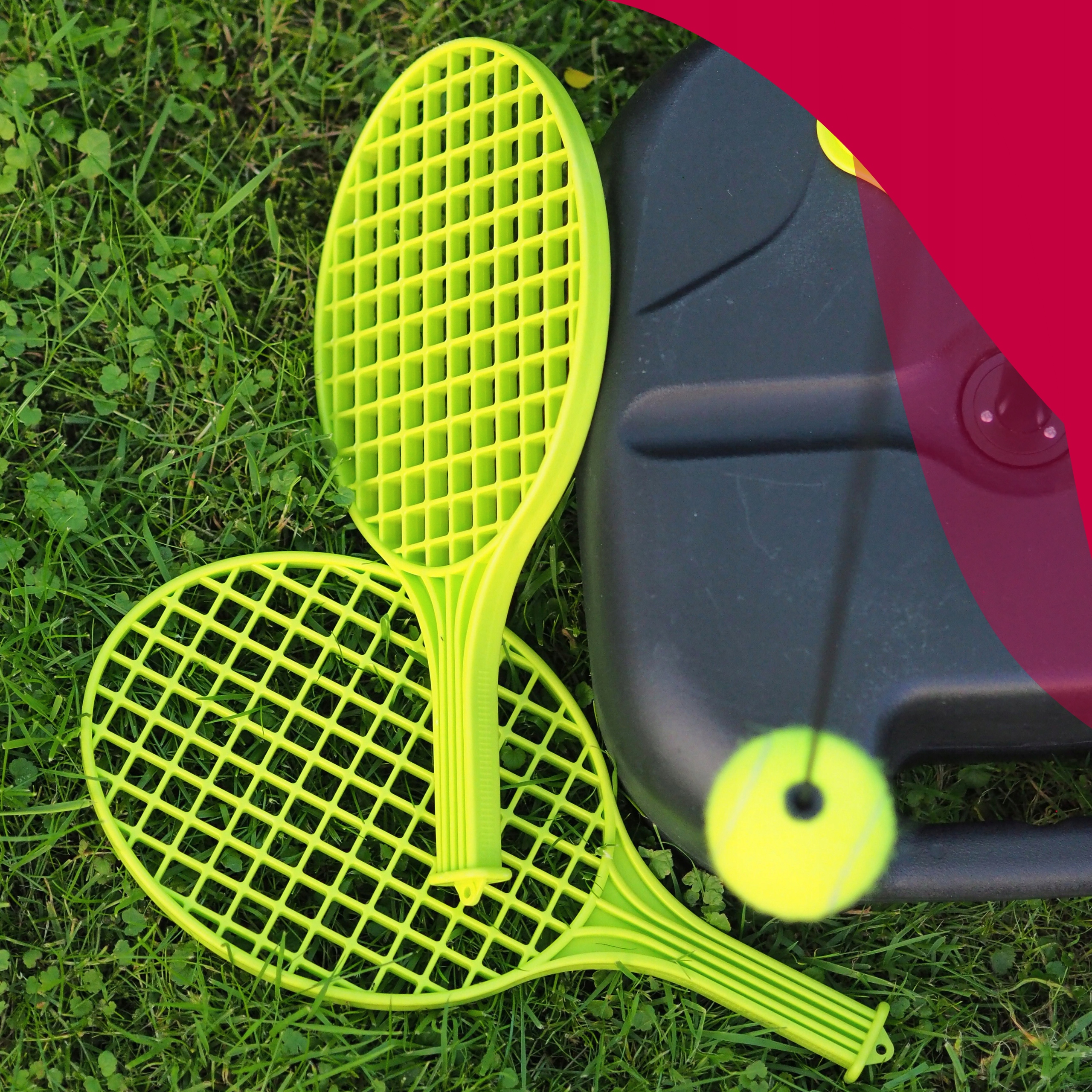 Po zakończonym treningu wszystkie elementy – rakietki, piłka na lince i pałąk – można schować w bazie, co chroni je przed zgubieniem i ułatwia utrzymanie porządku.