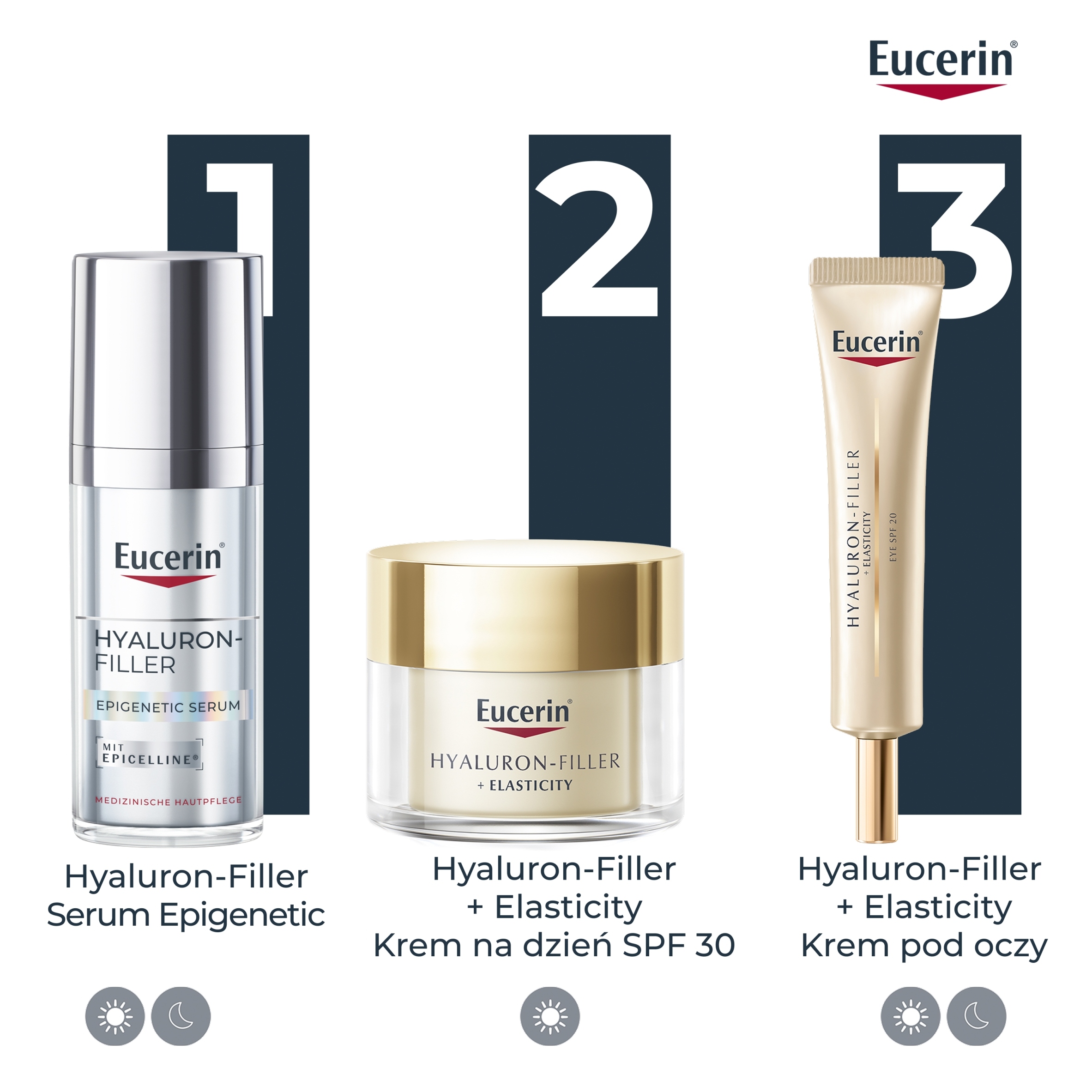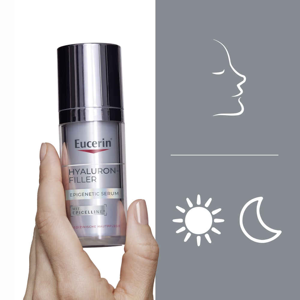 Eucerin Hyaluron-Filler Epigenetic to przeciwzmarszczkowe serum opracowane przy użyciu opatentowanej technologii Age Clock*. Formuła serum wzbogacona jest o przełomowy składnik Epicelline®, który widocznie odwraca 10 oznak starzenia się skóry i sprawia, że skóra wygląda młodziej, niż wskazuje na to jej wiek, zapewniając: