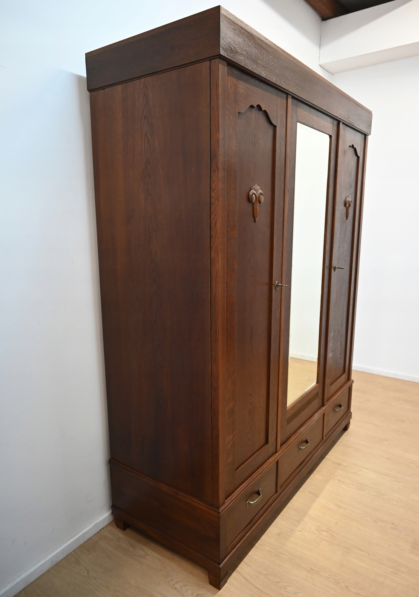 Stan bardzo dobry. Mebel przygotowany do użytkowania. Odświeżone zostały powierzchnie zewnętrzne jak i środek mebla. Mebel ma już swoje lata i ślady minionego czasu, które nie wpływają na jego odbiór estetyczny, są świadectwem autentyczności mebla. Szafę od razu można wstawić do mieszkania.