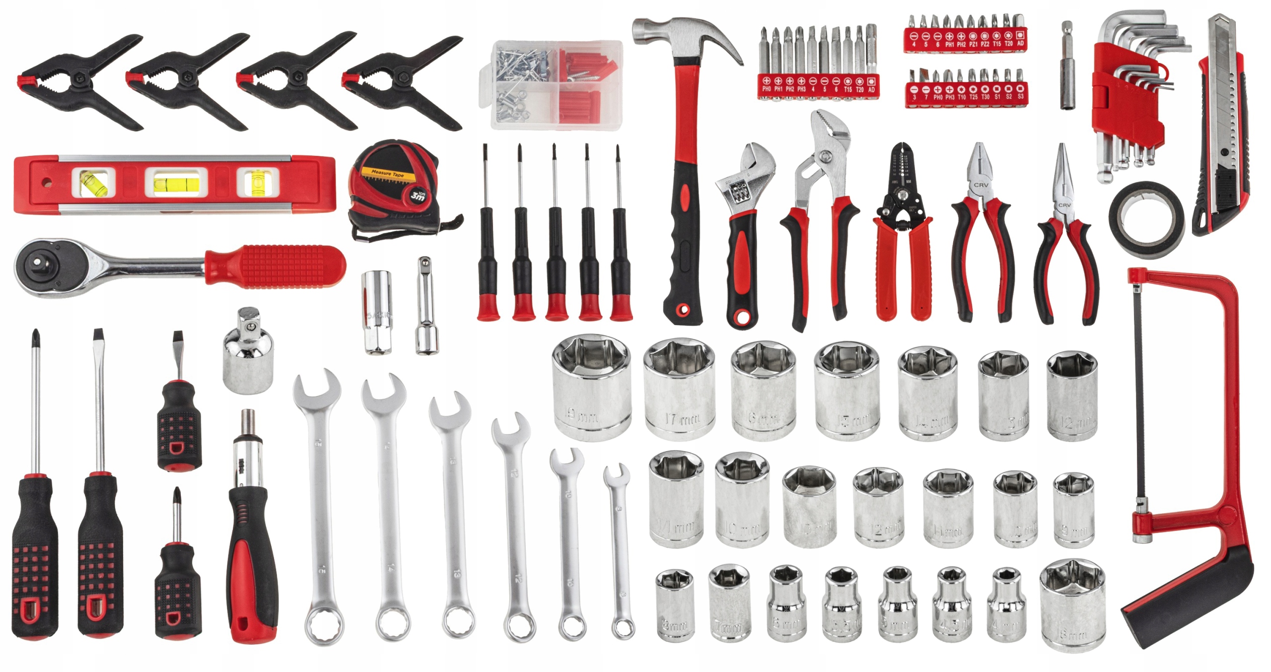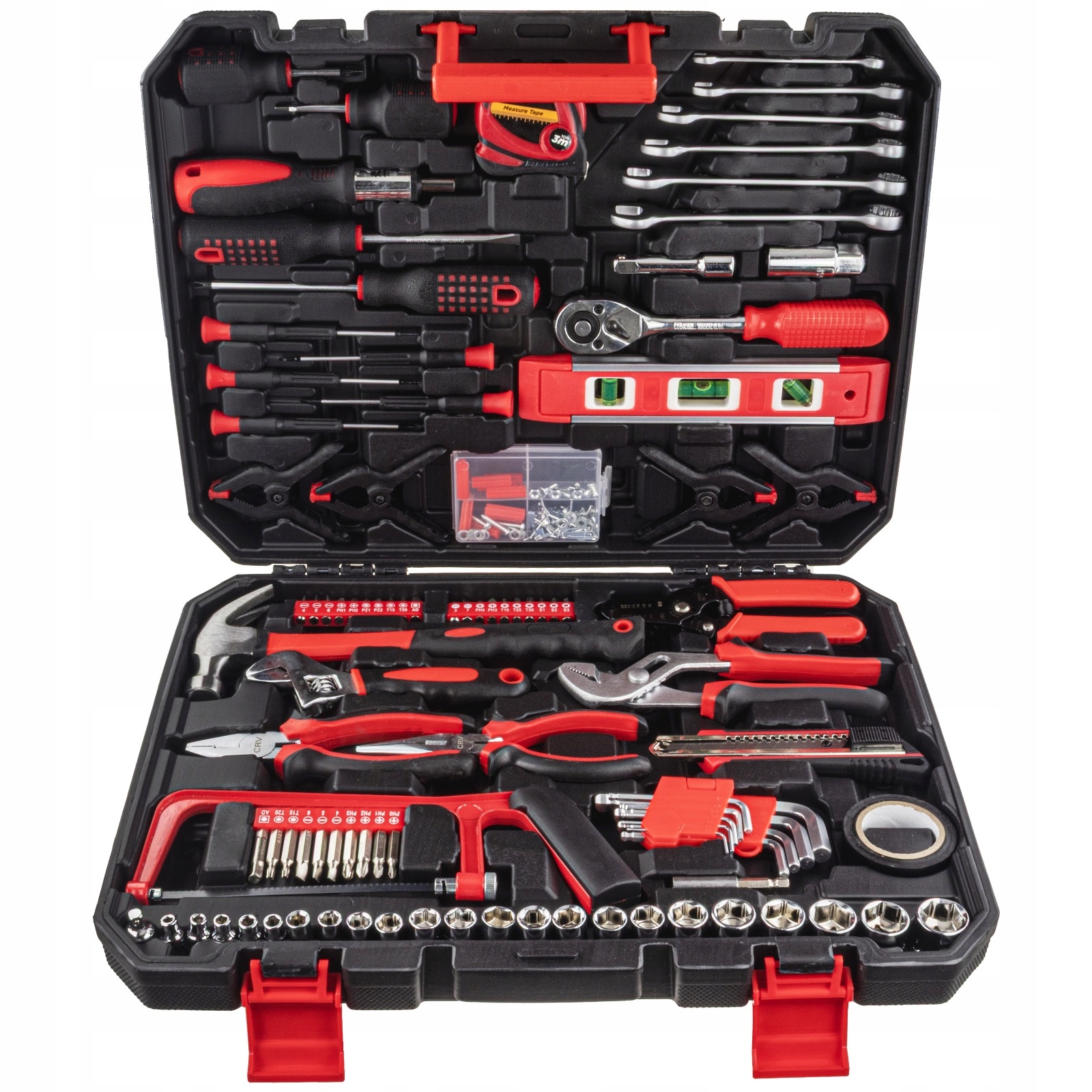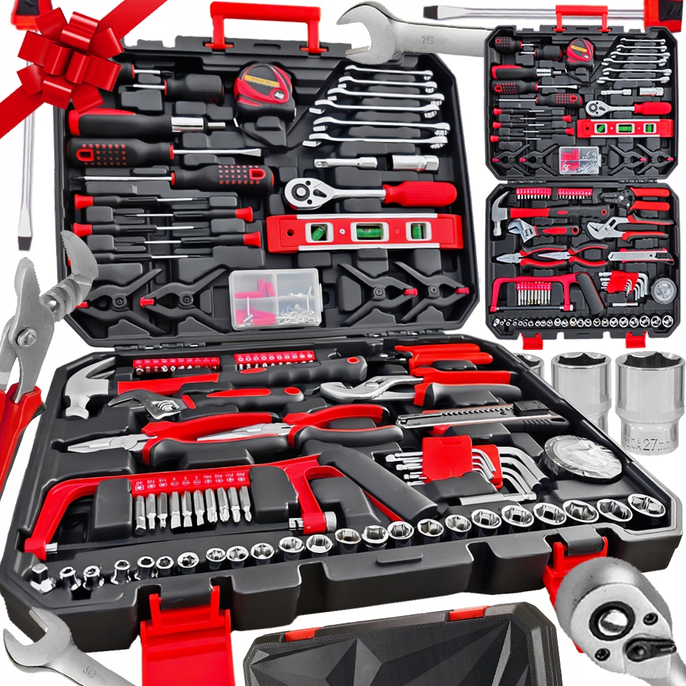 ⭐ W zestawie znajdują się zarówno narzędzia do prac mechanicznych (nasadki, grzechotka, klucze), jak i drobne narzędzia precyzyjne czy stolarskie (piła, młotek, poziomica).