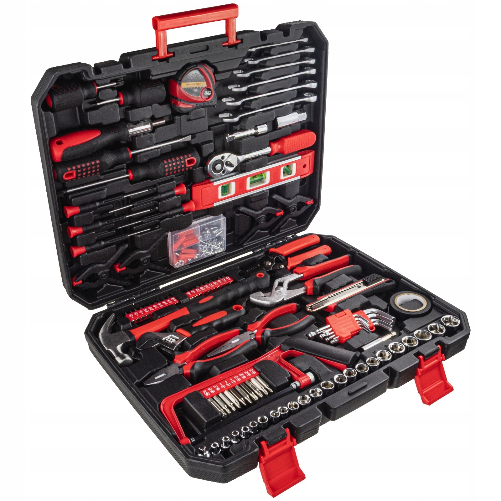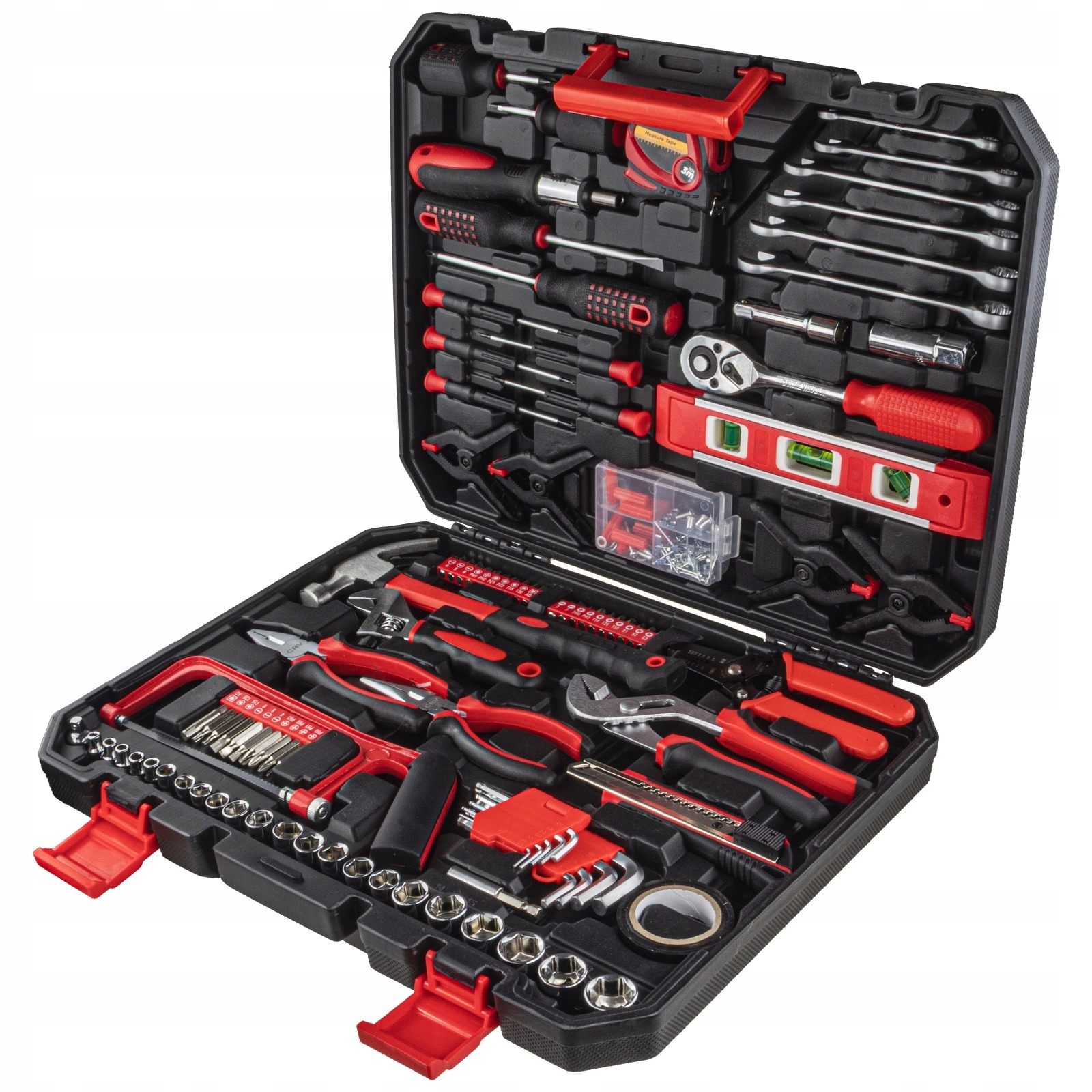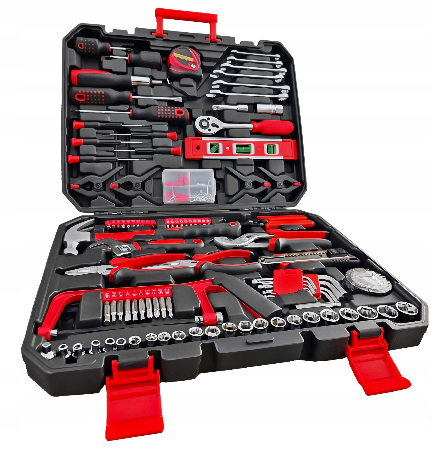 ⭐ W zestawie znajdują się zarówno narzędzia do prac mechanicznych (nasadki, grzechotka, klucze), jak i drobne narzędzia precyzyjne czy stolarskie (piła, młotek, poziomica).