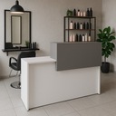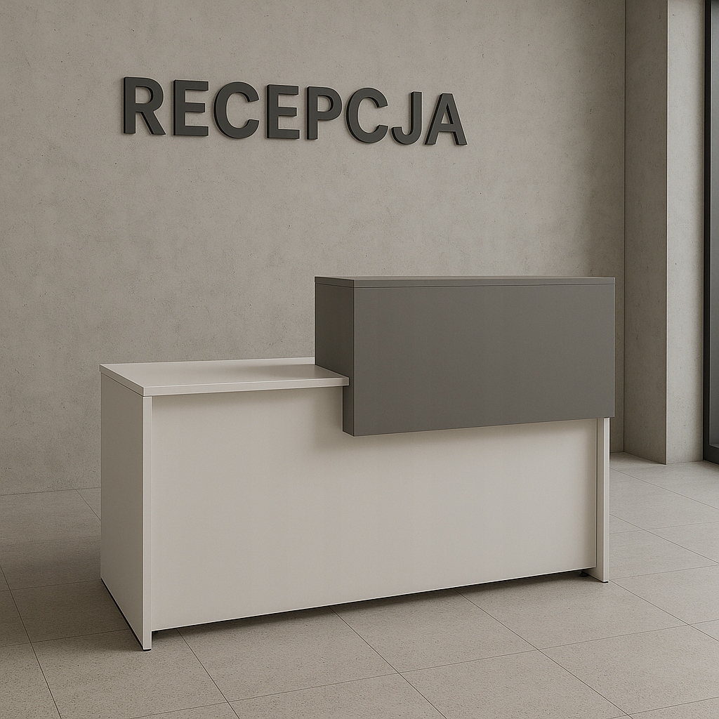 AJJ prezentuje nowoczesną ladę recepcyjną NOVA 180 cm, wykonaną z wysokiej jakości płyty laminowanej w eleganckim połączeniu kolorów białego i szarego.