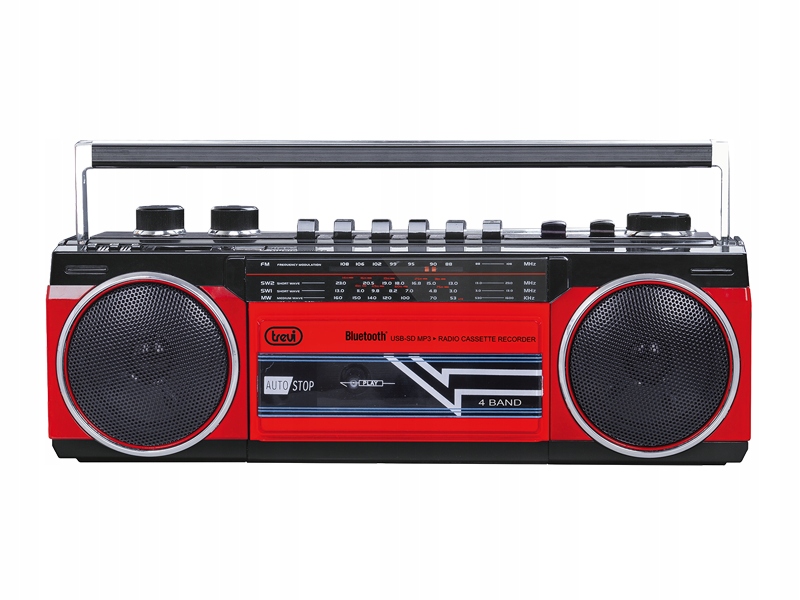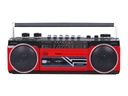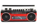 Radiomagnetofon w stylu klasycznego odtwarzacz z lat 80. Prostokątny z uchwytem do przenoszenia i okrągłymi głośnikami po obu stronach.