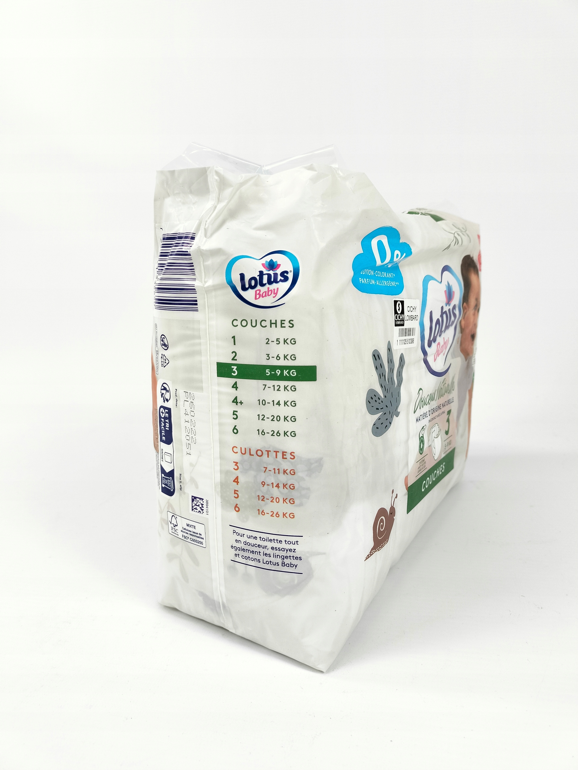 Opakowanie jest wykonane w ponad 50% z materiałów odnawialnych ze zrównoważonej uprawy trzciny cukrowej. Pieluszki Lotus Baby Douceur Naturelle posiadają certyfikat EU Ecolabel, a celuloza wkładu chłonnego posiada certyfikat FSC®, co gwarantuje mniejszy wpływ na środowisko i odpowiedzialną gospodarkę leśną.