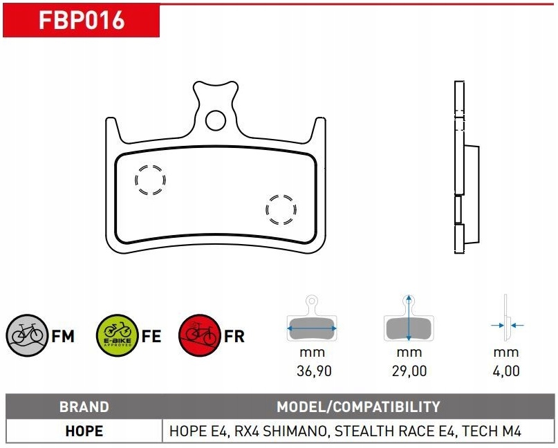 FBP***FM - ALL-ROUND mieszanka półmetaliczna wykorzystująca technologię wiązania żywicą uniwersalna mieszanka, nadaje się do szerokiego zakresu zastosowań oferuje komfort oczekiwany podczas jazdy rekreacyjnej i szosowej oraz wydajność niezbędną podczas zjazdów certyfikat ECE-R90 klocki hamulcowe oraz płytki pod okładzią wykończone są według ściśle określonych standardów FBP***FE - E-BIKE mieszanka półmetaliczna wykorzystująca technologię wiązania żywicą zaprojektowany specjalnie dla rowerów elektrycznych certyfikat ECE-R90 klocki hamulcowe oraz płytki pod okładzią wykończone są według ściśle określonych standardów FBP***FR - RACING mieszanka półmetaliczna wykorzystująca technologię wiązania żywicą zaprojektowane specjalnie do wyścigów o dużej wytrzymałości certyfikat ECE-R90 klocki hamulcowe oraz płytki pod okładzią wykończone są według ściśle określonych standardów