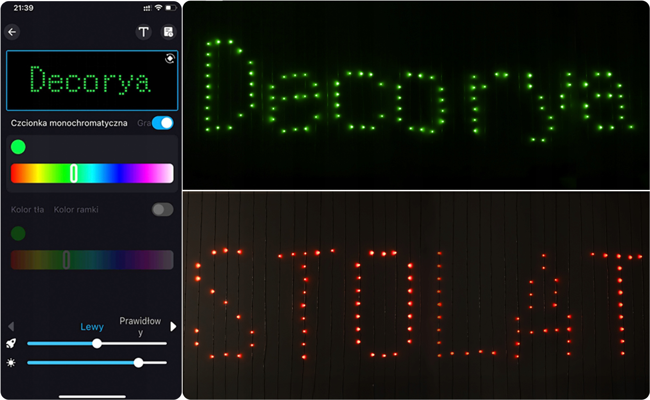 Animacje i napisy będą poruszały się przez całą szerokość lub wysokość takiego zestawu. Lampki możesz połączyć ze sobą poziomo lub pionowo.