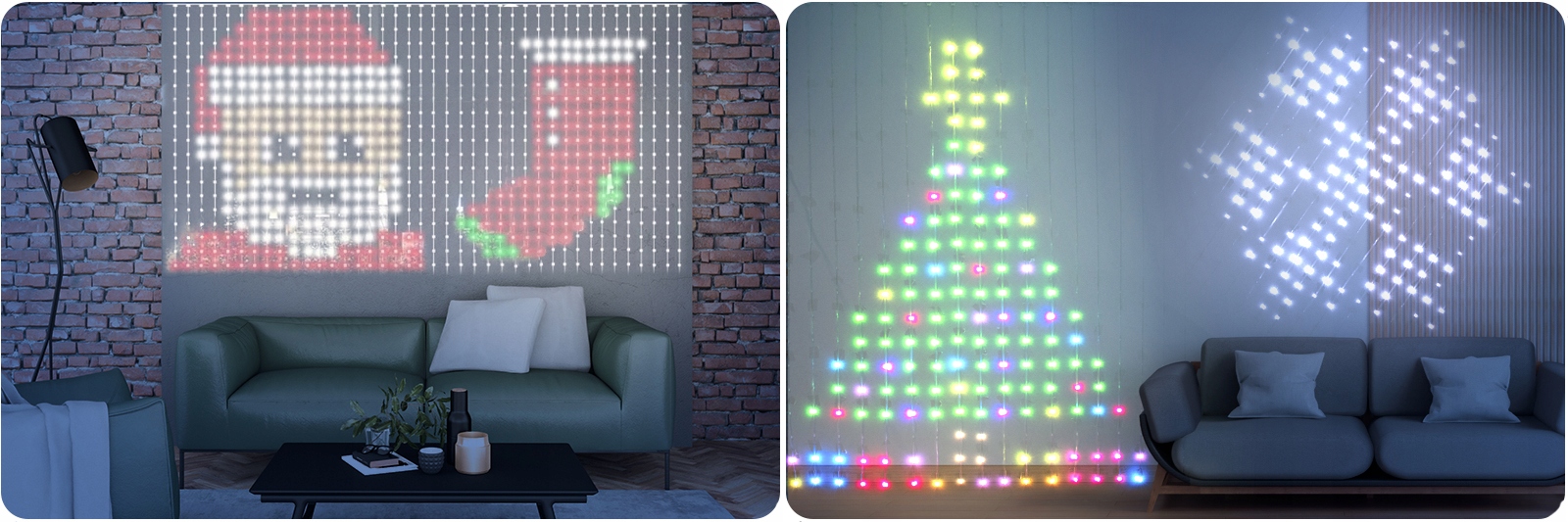 Kurtyna LED ze świątecznymi wzorami rozświetli Twoje otoczenie przytulnym, kolorowym światłem, wprawiając wszystkich mieszkańców i sąsiadów w magiczny, świąteczny nastrój. Inteligentny zestaw lampek to innowacyjny i efektowny sposób na przepiękną dekorację Świateczną. Stwórz swoja własną kompozycję i udekoruj okno, ścinę w pokoju lub elewację budynku!