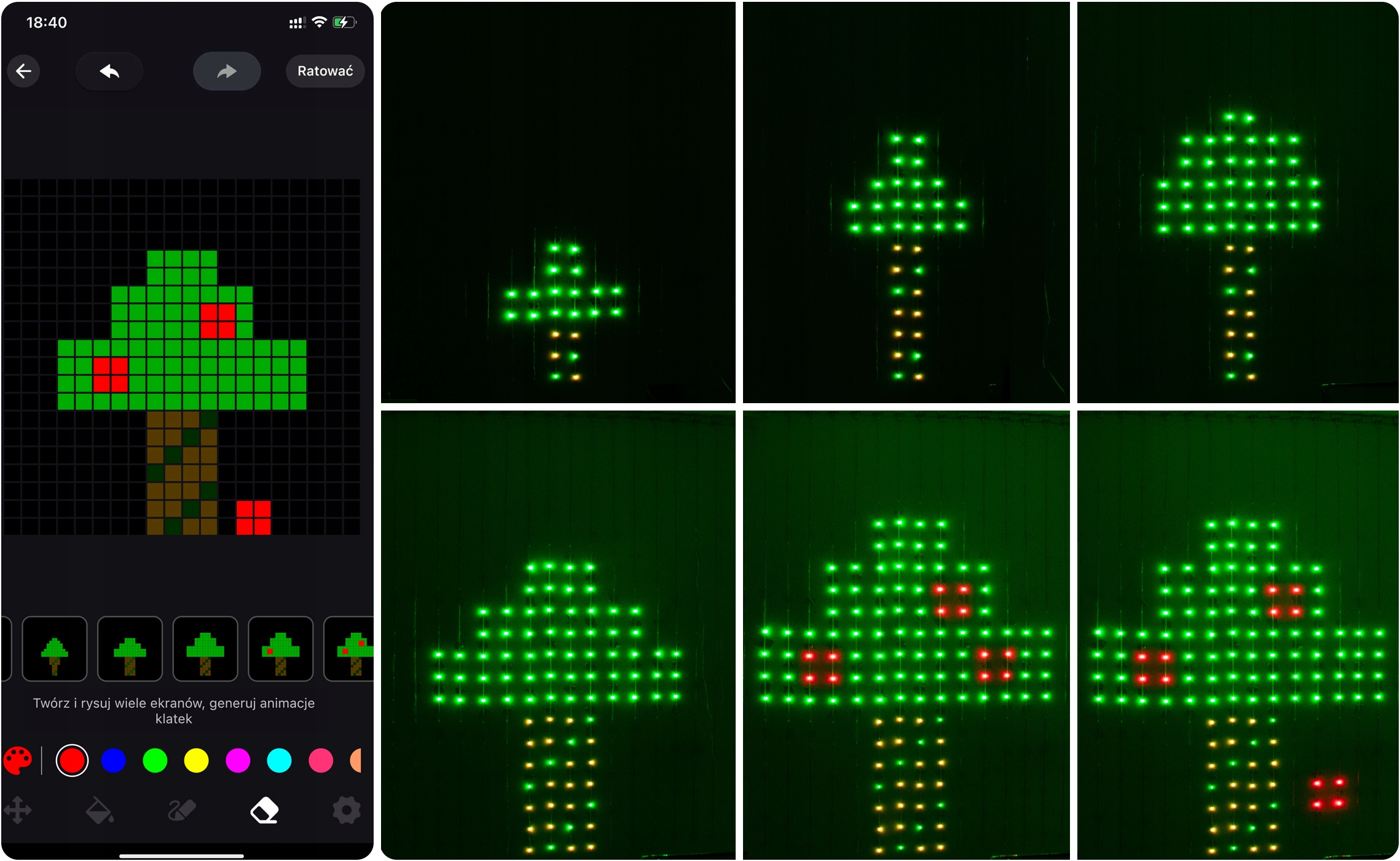 Zakładka "DIY" znajdująca się w aplikacji umożliwia proste tworzenie własnych wzorów oraz animacji. Rysuj dowolne rysunki w wybranych kolorach i obserwuj jak na bieżąco obrazek pojawia się na kurtynie LED.
