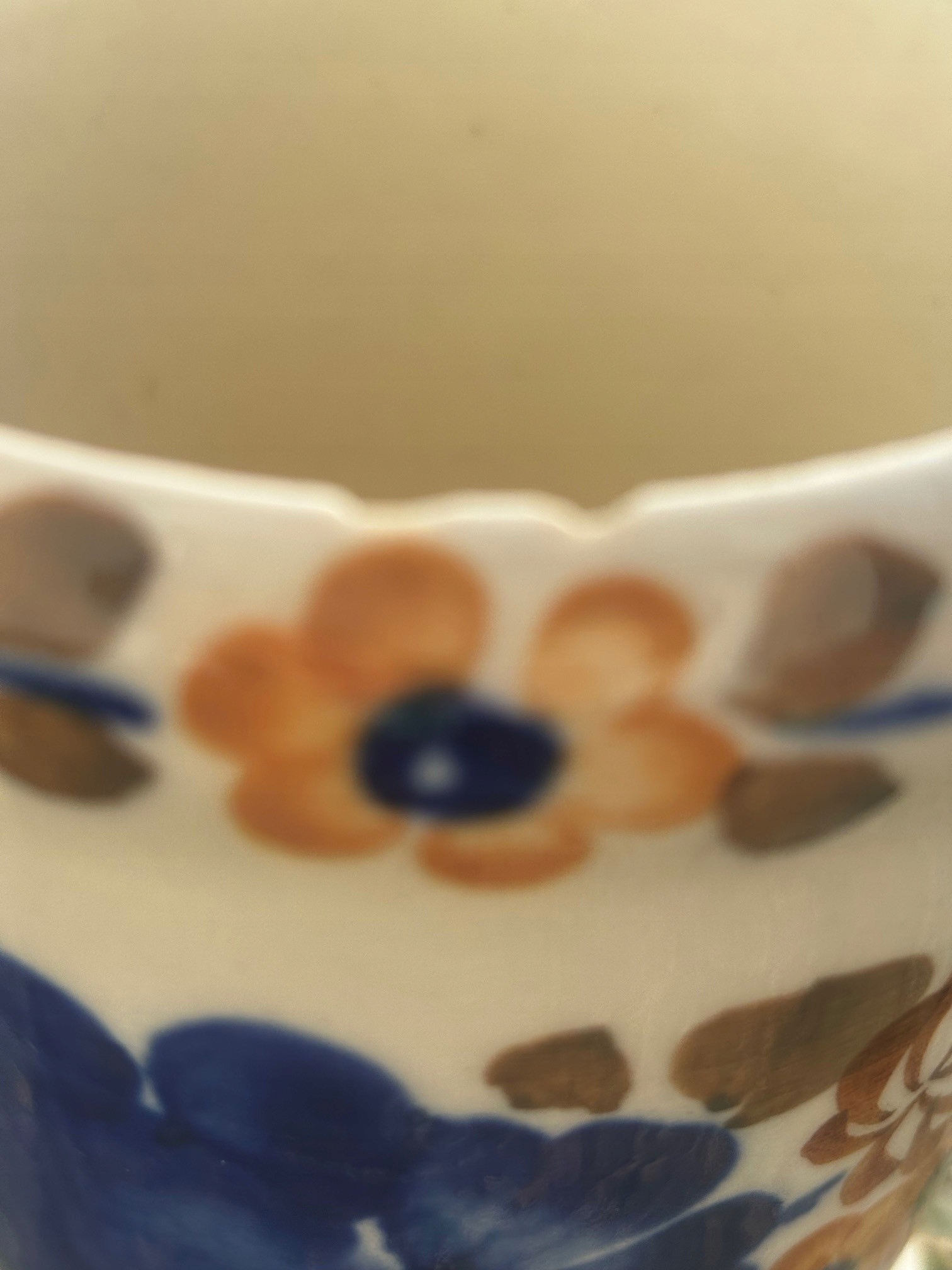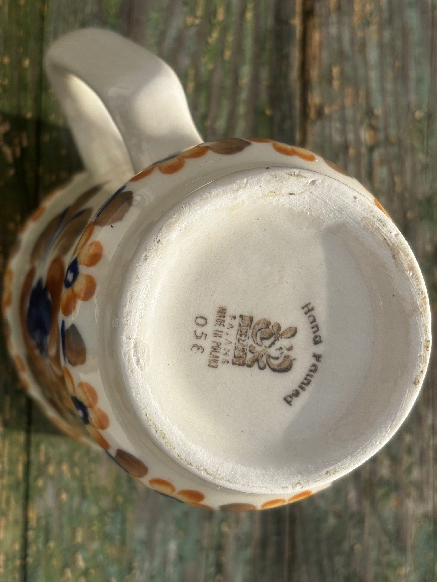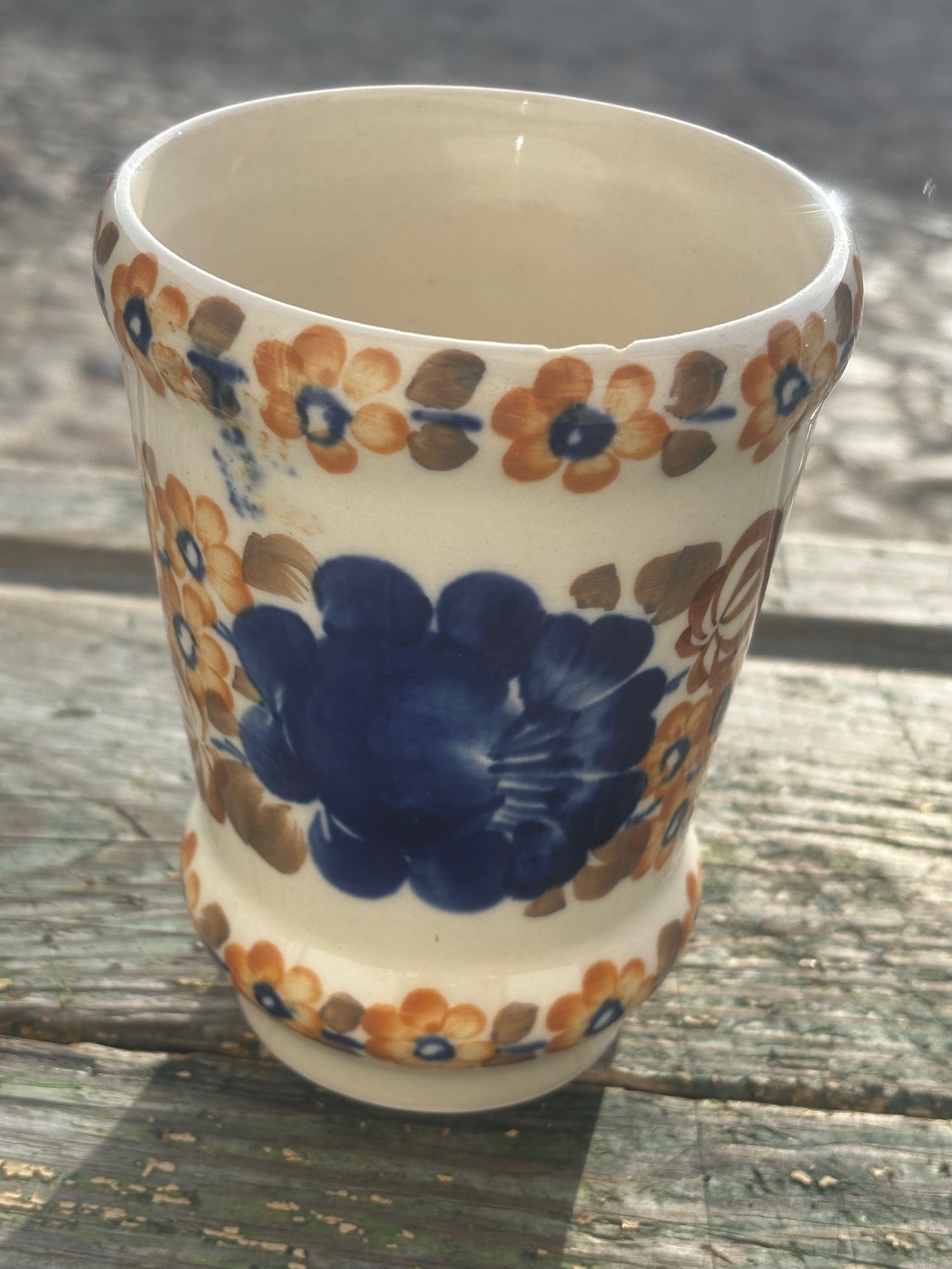 Fajansowy kubek kufel z Włocławka z lat 70/80-tych. Sygnowany. Ręcznie malowany. Wymiary; wys. 14,5 x 14,5 x 10 cm. 2 drobne ubytki na obrzeżu, poza tym kubek wygląda na nieużwany. Stan kubka pokazano na zdjęciach.