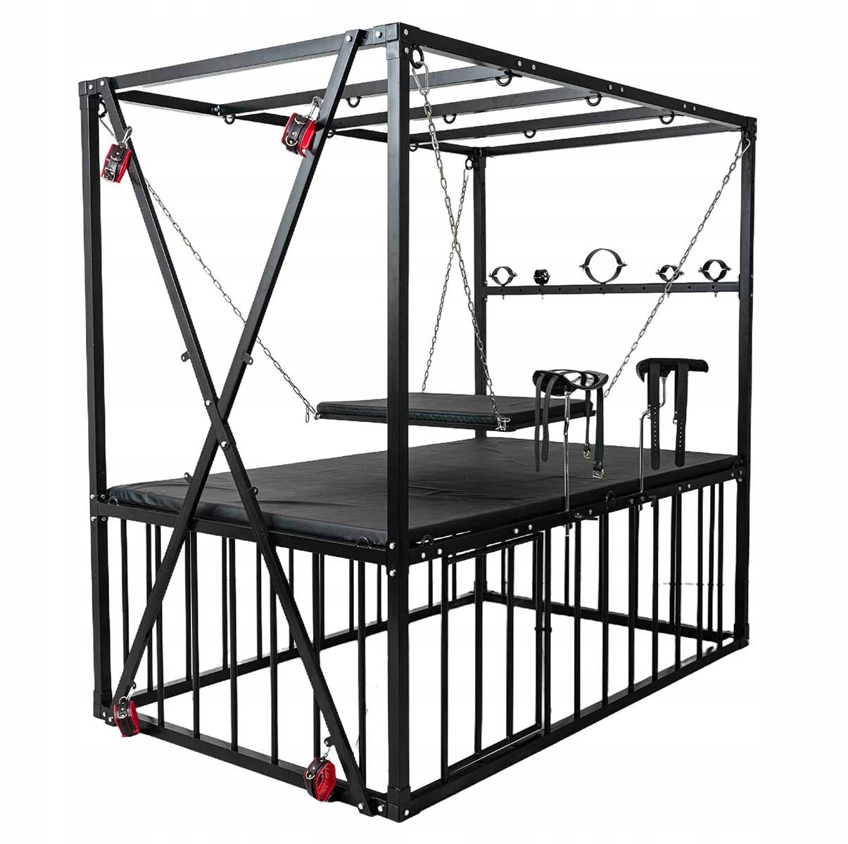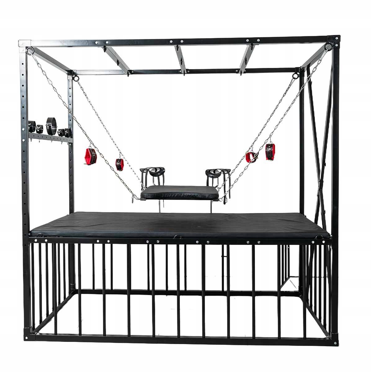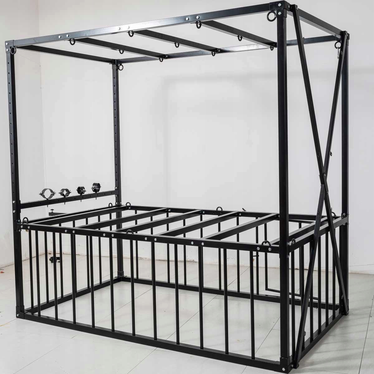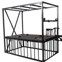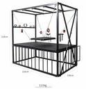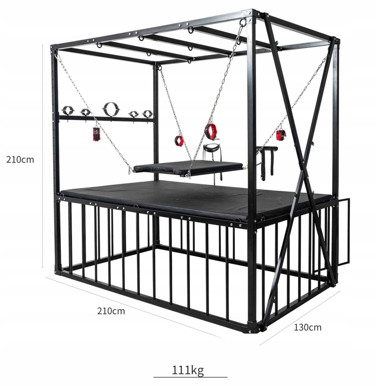Кровать BDSM в форме запаса размером 210 × 210 × 130 см, полностью из стали повышенной выносливости. Все покрыто матовым черным порошковым покрытием, обеспечивающим устойчивость к царапинам и коррозии. Конструкция рассчитана на стабильность и легкая сборка.