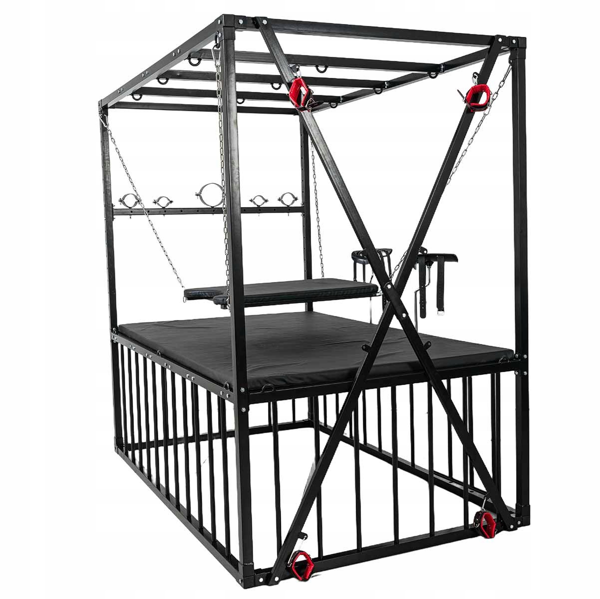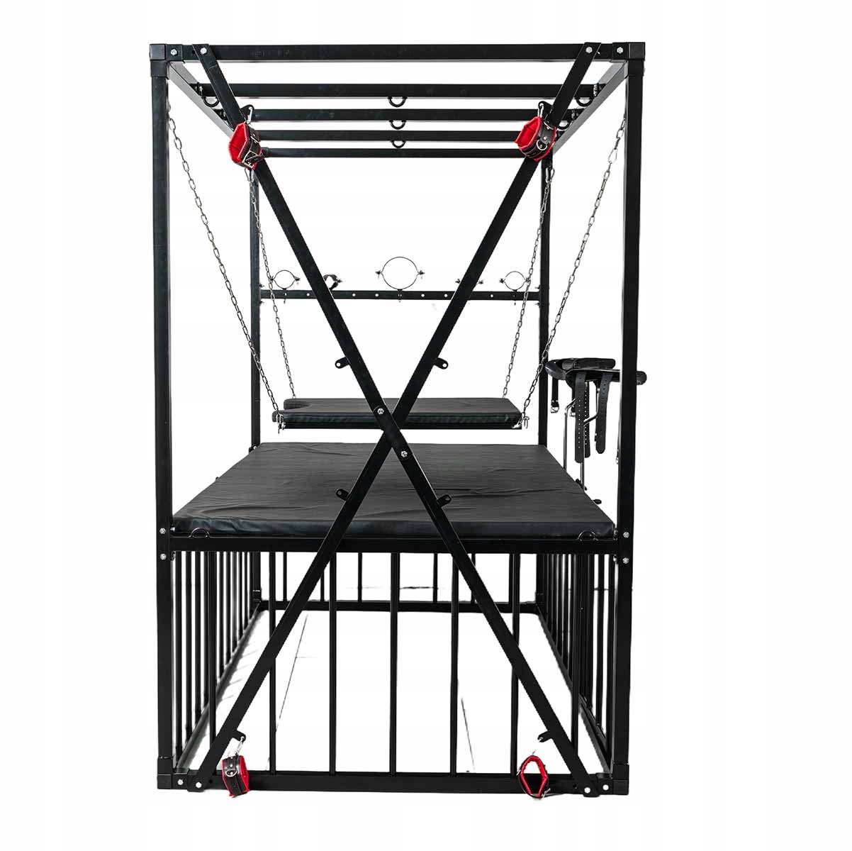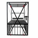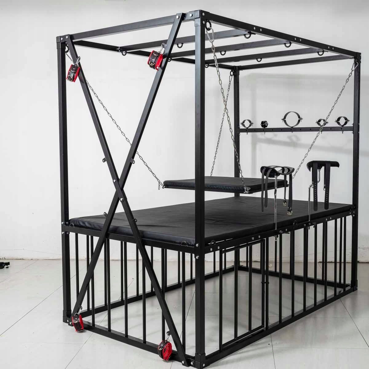 Кровать BDSM в форме запаса размером 210 × 210 × 130 см, полностью из стали повышенной выносливости. Все покрыто матовым черным порошковым покрытием, обеспечивающим устойчивость к царапинам и коррозии. Конструкция рассчитана на стабильность и легкая сборка.