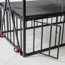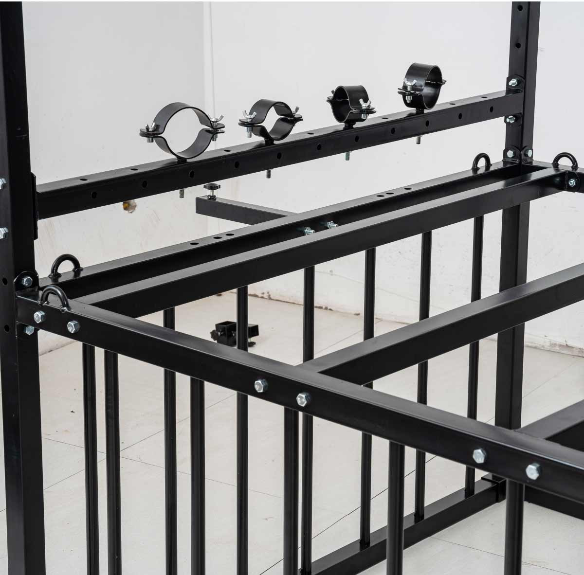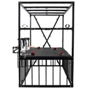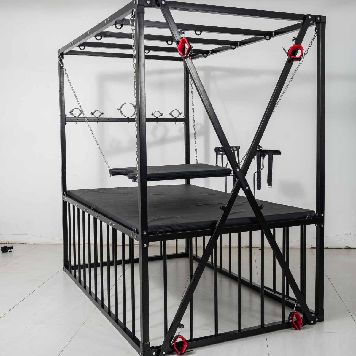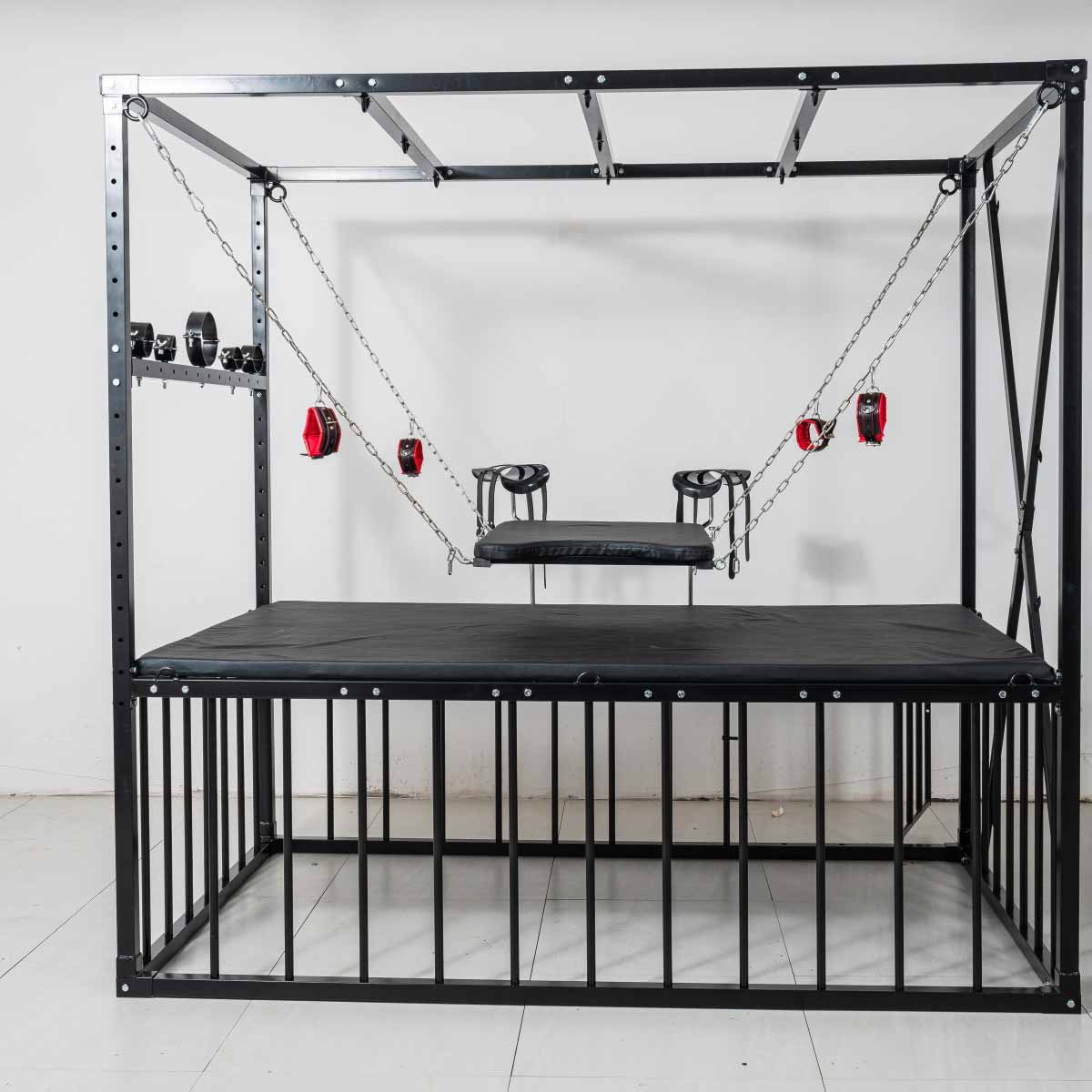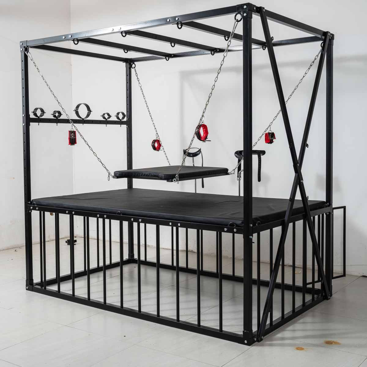 Кровать BDSM в форме запаса размером 210 × 210 × 130 см, полностью из стали повышенной выносливости. Все покрыто матовым черным порошковым покрытием, обеспечивающим устойчивость к царапинам и коррозии. Конструкция рассчитана на стабильность и легкая сборка.