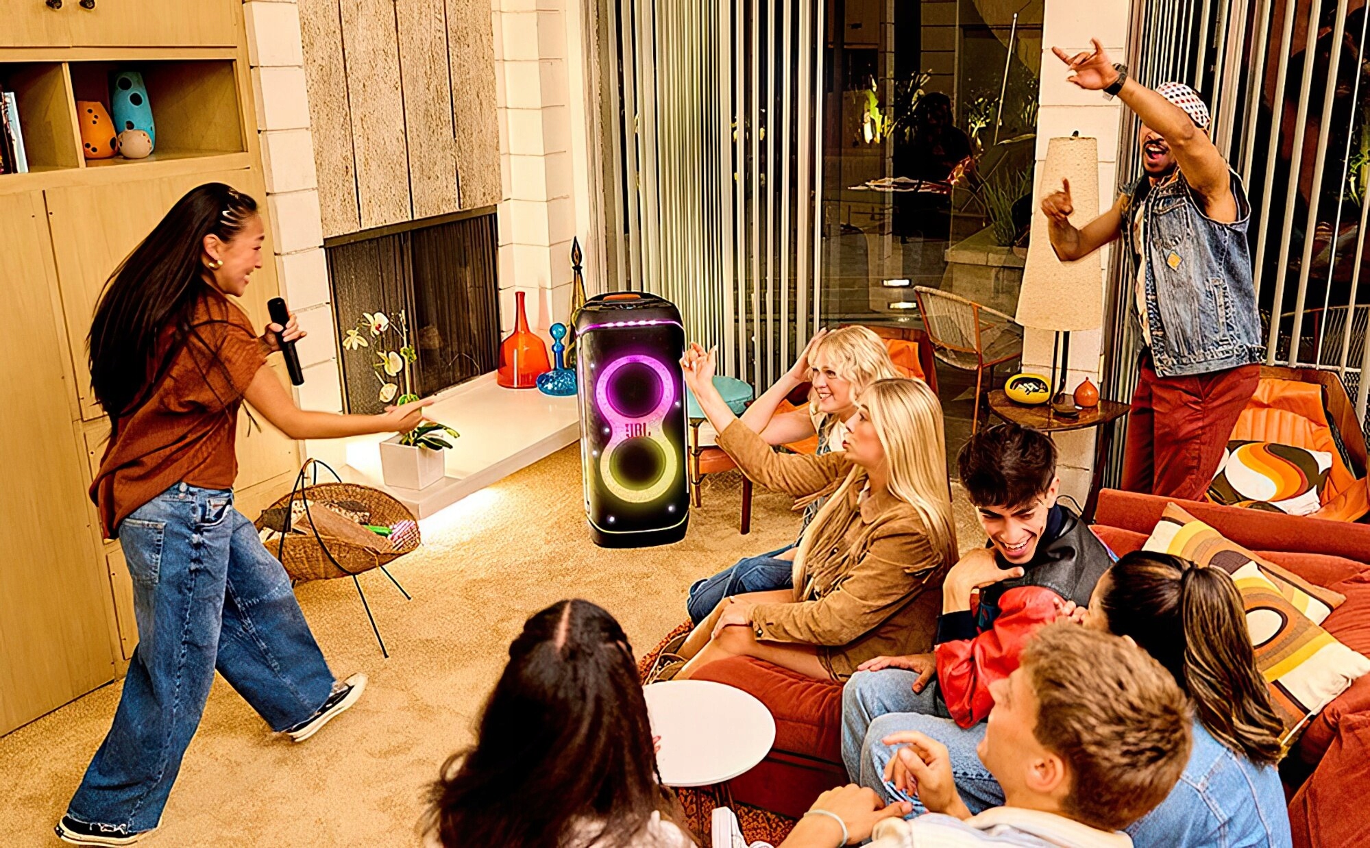 Żeby podkręcić dźwięk jeszcze bardziej, można sparować dwa głośniki PartyBox 720 w stereo albo bezprzewodowo połączyć więcej modeli obsługujących technologię JBL Auracast™ – muzyka rośnie razem z klimatem imprezy. Natomiast nie trzeba stać przy głośniku: wystarczy aplikacja JBL PartyBox, by zdalnie sterować muzyką, korekcją dźwięku i pokazami świetlnymi – zza baru, z parkietu i każdego innego miejsca. Z imprezą na zewnątrz też nie ma problemu – szersze kółka gładko jadą po nierównym terenie, a zintegrowany uchwyt ułatwia przenoszenie głośnika z miejsca na miejsce. Niewątpliwym atutem jest też bezproblemowa łączność audio o wysokiej jakości. Wejście USB-C pozwala podpiąć ulubioną apkę do streamingu albo karaoke z jakością dźwięku, która robi robotę, więc każdy może dorzucić coś od siebie. Łatwe podłączenie do mikrofonu, gitary lub konsoli DJ-a dzięki dwóm wejściom XLR to dodatkowa możliwość występów na żywo.