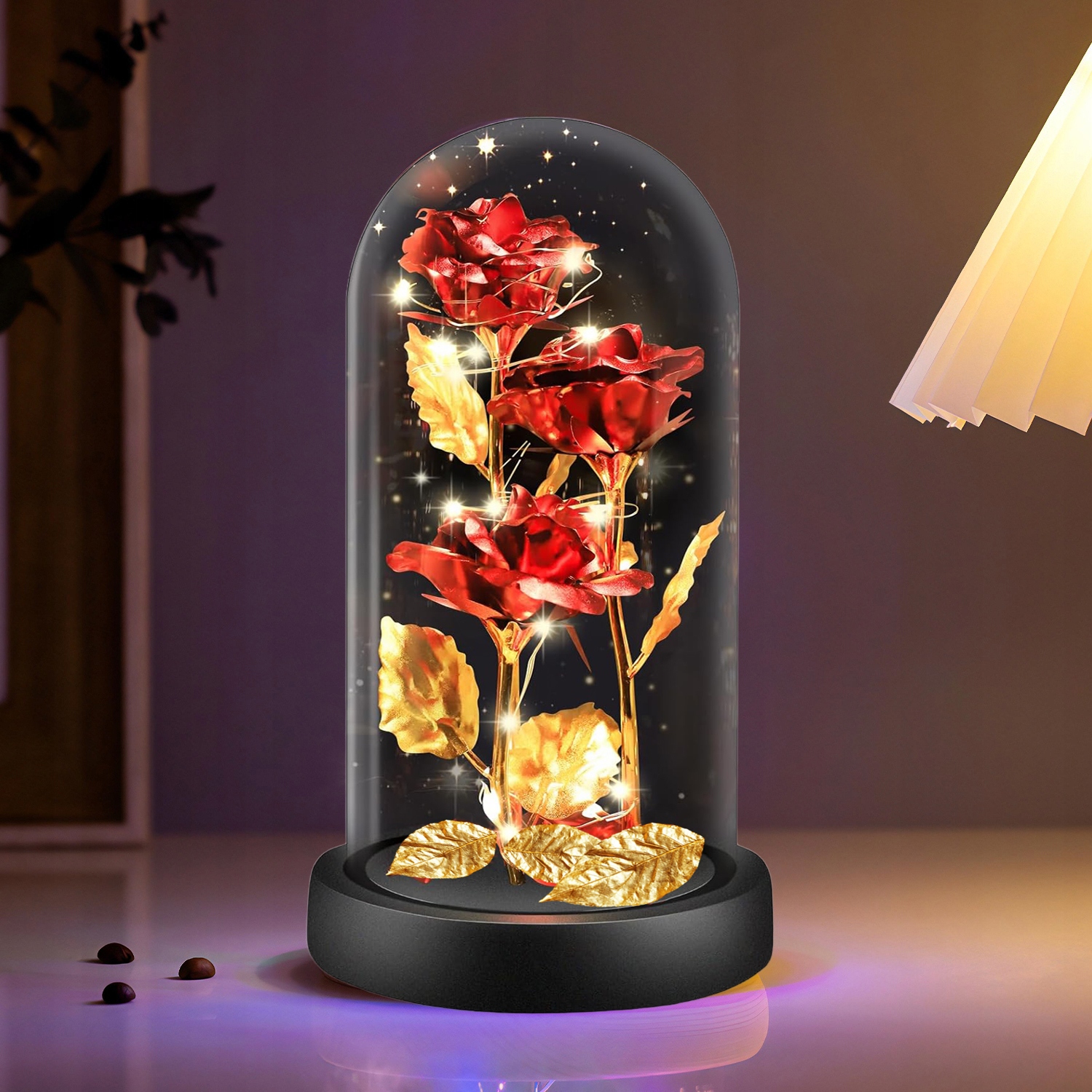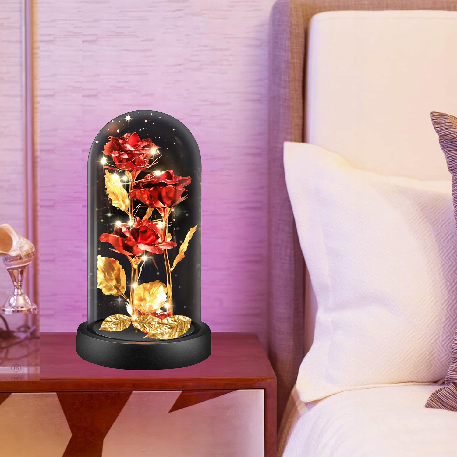 Szklana kopuła może również wzmacniać symboliczne przesłanie wiecznej róży, podkreślając jej niezmienny charakter i trwałość, zamkniętej w pięknym i ochronnym otoczeniu.