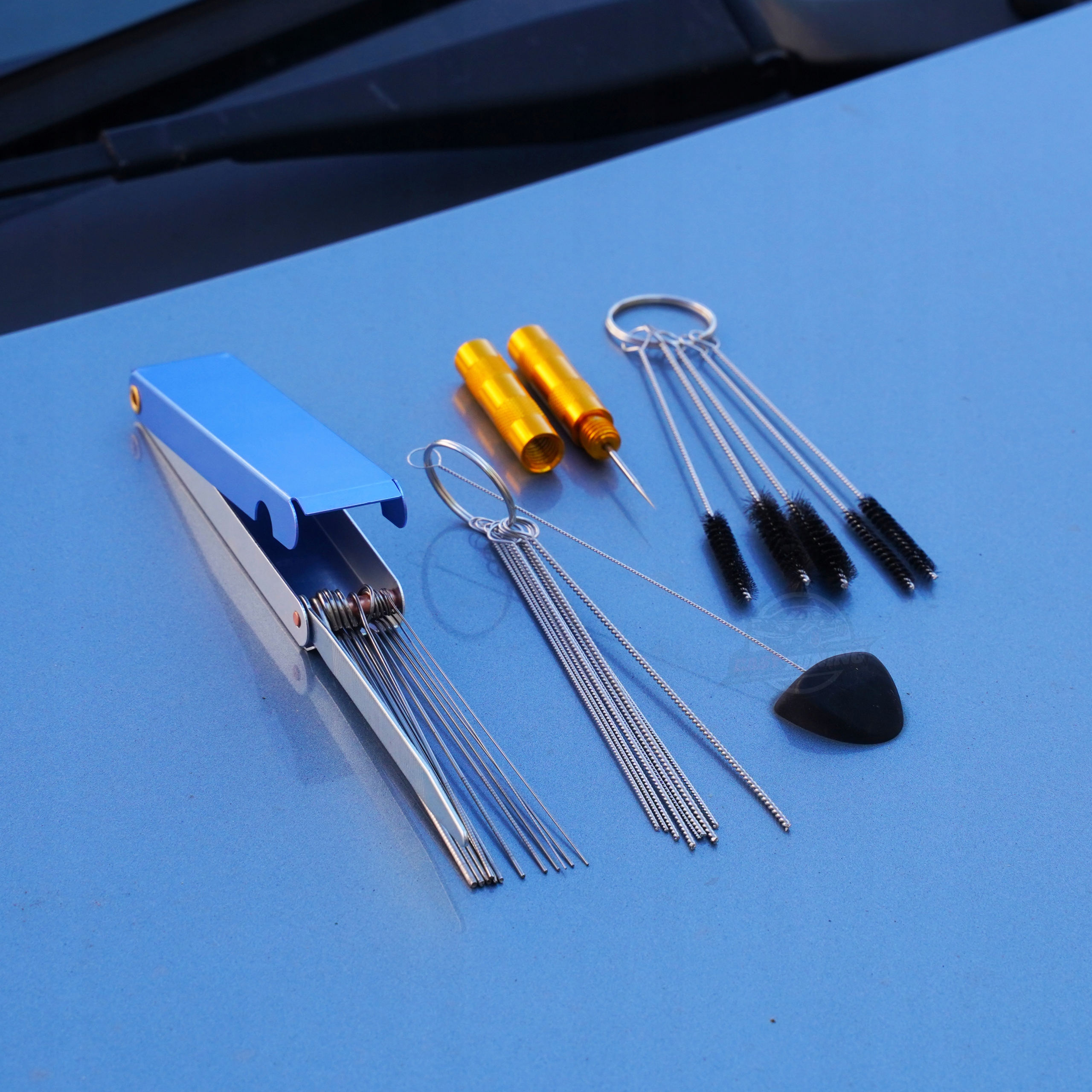 Zestaw do czyszczenia dysz zawiera aż 26 różnorodnych narzędzi, takie jak igły do regulacji kierunku spryskiwania, szczoteczki i druciki zaprojektowane specjalnie dla różnych rozmiarów dysz. Wszystkie narzędzia są posegregowane i spięte brelokami, co ułatwia ich przechowywanie i zapobiega zgubieniu. Zestaw do regulacji dysz jest kompaktowy, co sprawia, że jest łatwy do przechowania w bagażniku lub schowku samochodu.