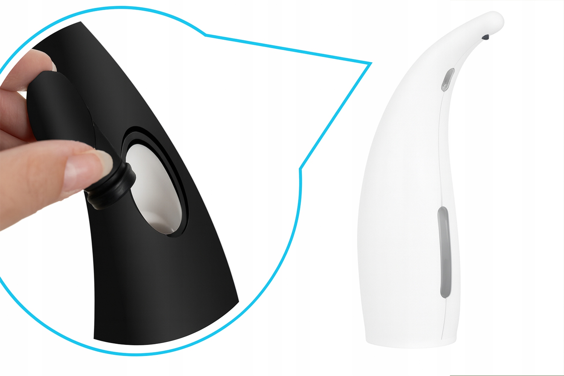 Dozownik został zaprojektowany z myślą o maksymalnej wygodzie użytkownika. Wystarczy zbliżyć dłoń do sensora, aby dozownik automatycznie poda odpowiednią ilość mydła w płynie lub żelu. Proces ten jest szybki, bezproblemowy i bezpieczny. Dodatkowo uzupełnianie pojemnika jest wyjątkowo łatwe – wystarczy wyciłągnąć korek w górnej części urządzenia, by dolać nowy płyn.