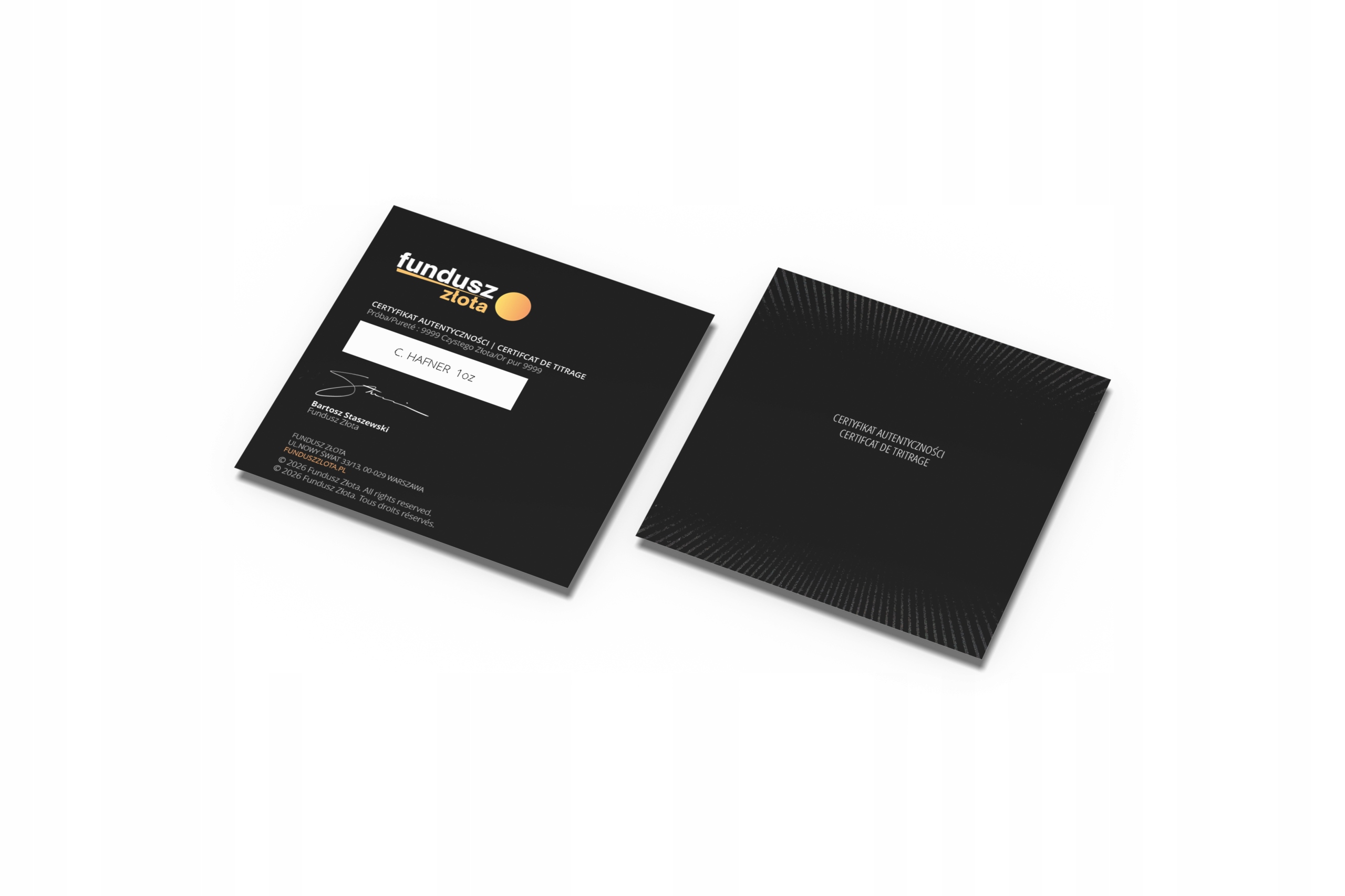 Dodaj do swojej inwestycji elegancki certyfikat autentyczności, potwierdzający pochodzenie i oryginalność posiadanej sztabki lub monety.