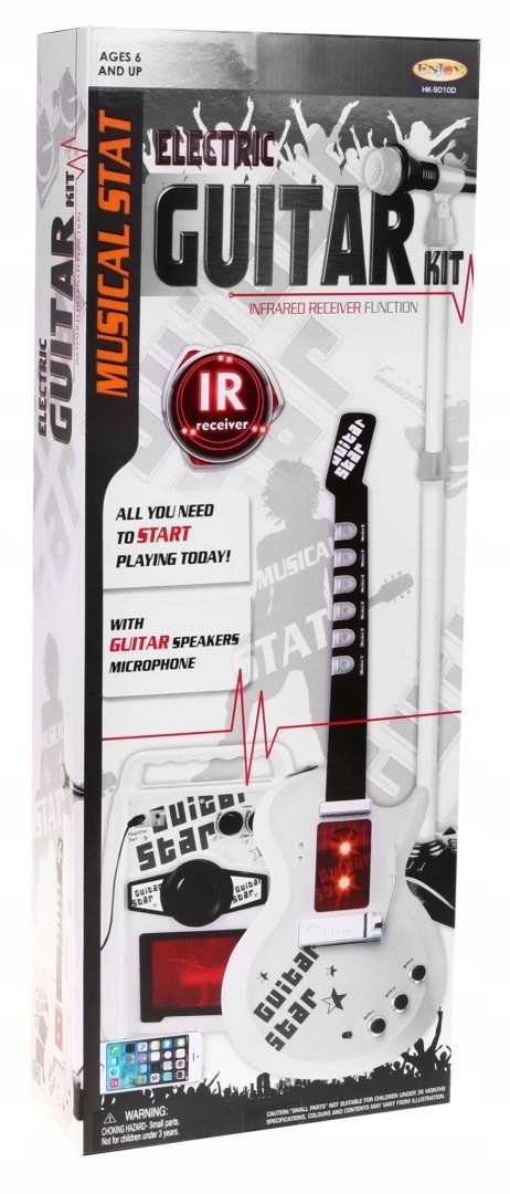 Gitara zasilana jest 3 bateriami typu AA 1,5V (brak w zestawie), a piec 3 bateriami typu AA 1,5V (brak w zestawie).