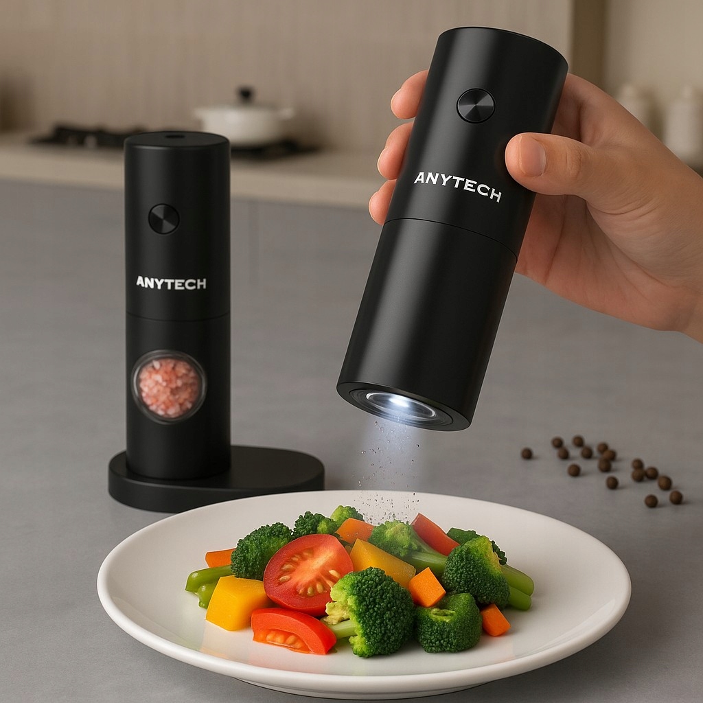 Nowoczesny młynek elektryczny Anytech z wbudowanym oświetleniem LED to niezastąpiony pomocnik w każdej kuchni.