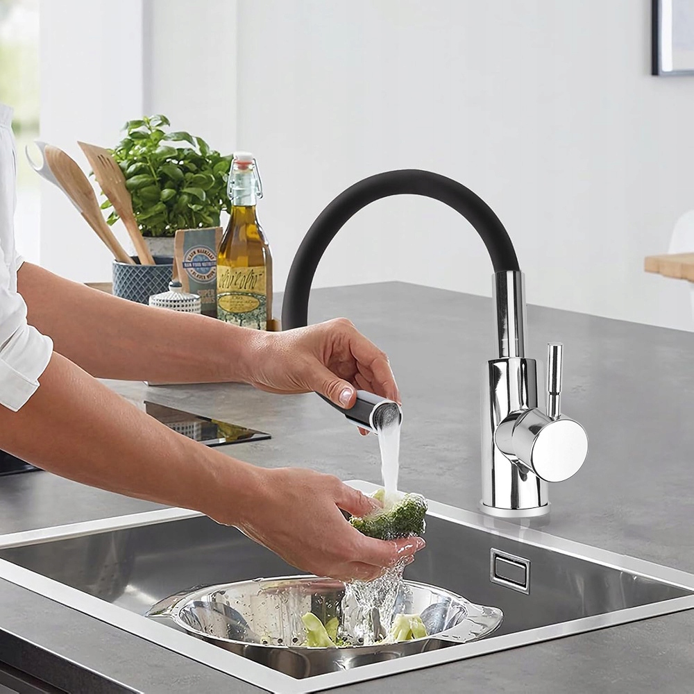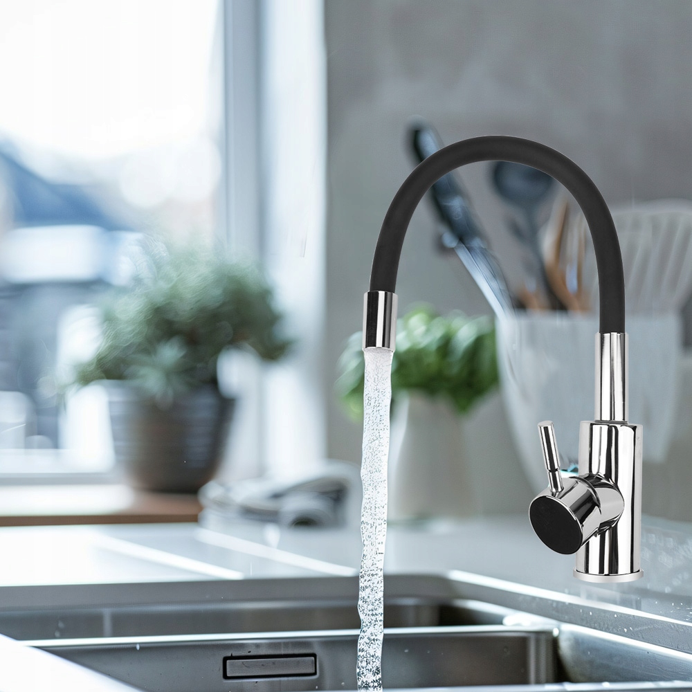 ➡️ GIĘTKA WYLEWKA – elastyczny silikonowy wąż pozwala dowolnie ustawić strumień wody, co ułatwia mycie dużych garnków i płukanie całego zlewu.