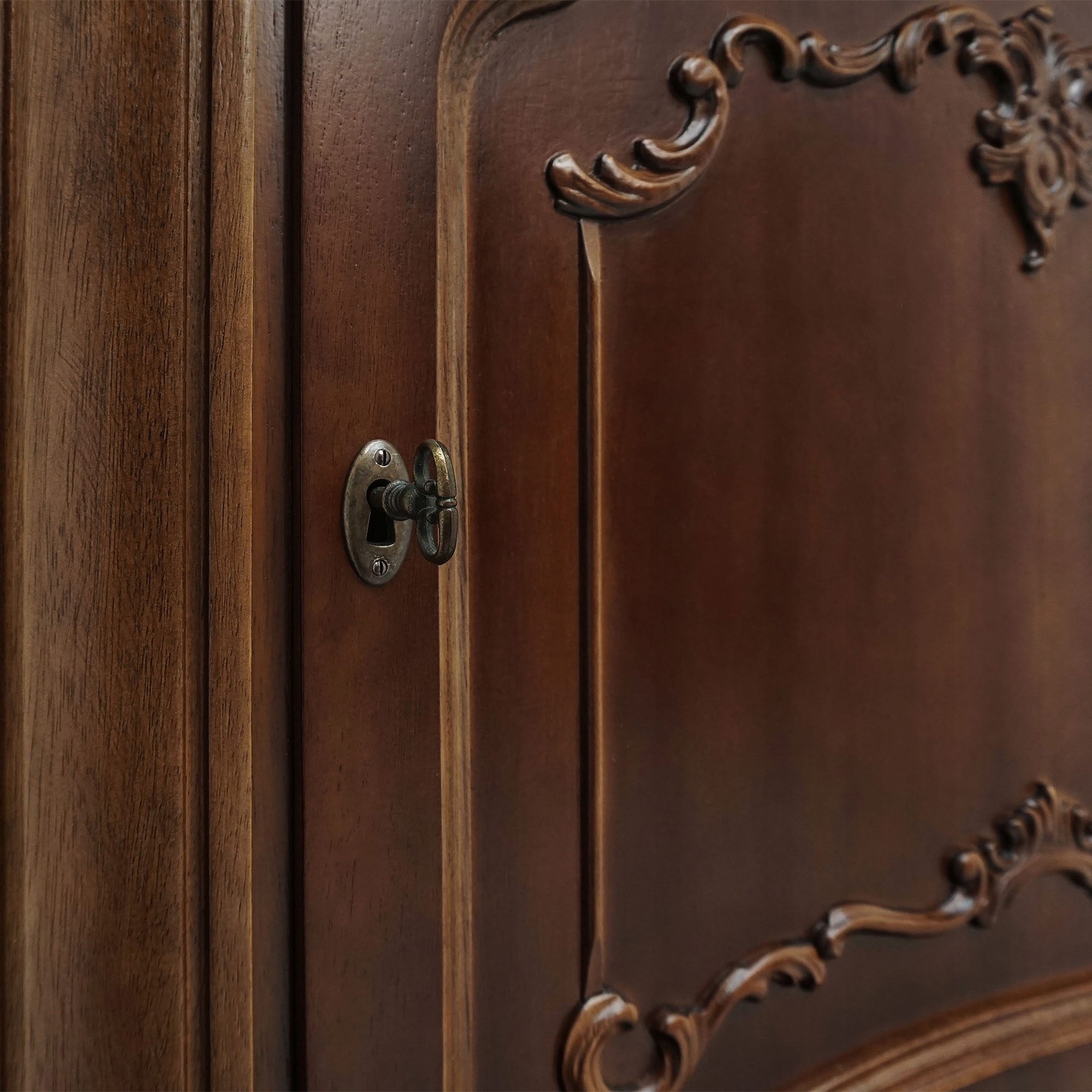 Górna część witryny posiada przeszklone drzwi z dekoracyjnymi szprosami, idealne do ekspozycji porcelany, szkła lub książek. Dolna szafka z bogato zdobionymi frontami oferuje praktyczną przestrzeń do przechowywania.