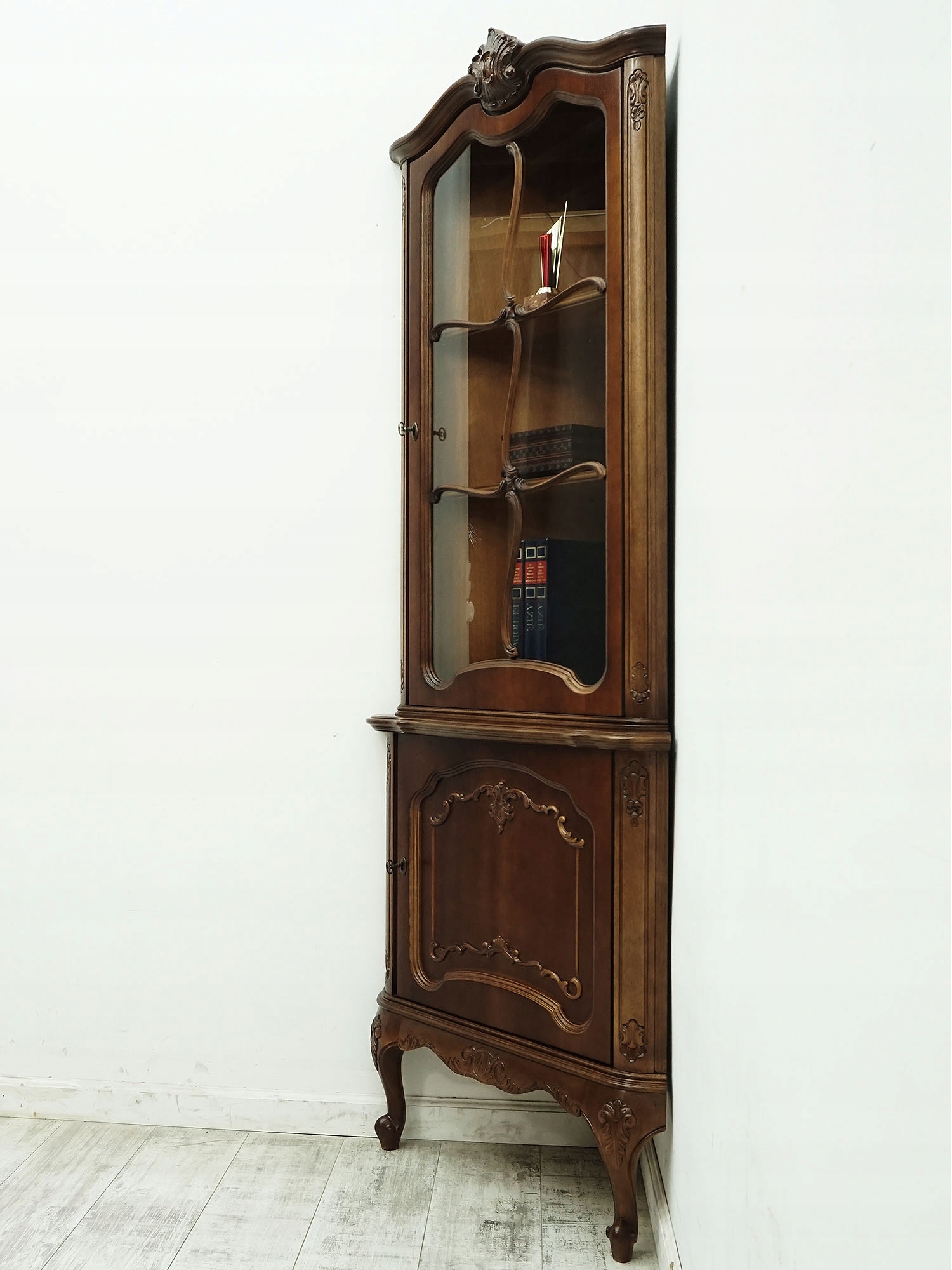 Ta witryna narożna w stylu ludwikowskim łączy funkcjonalność z artystycznym wykończeniem – idealna do wnętrz urządzonych w stylu klasycznym, francuskim, vintage lub glamour.