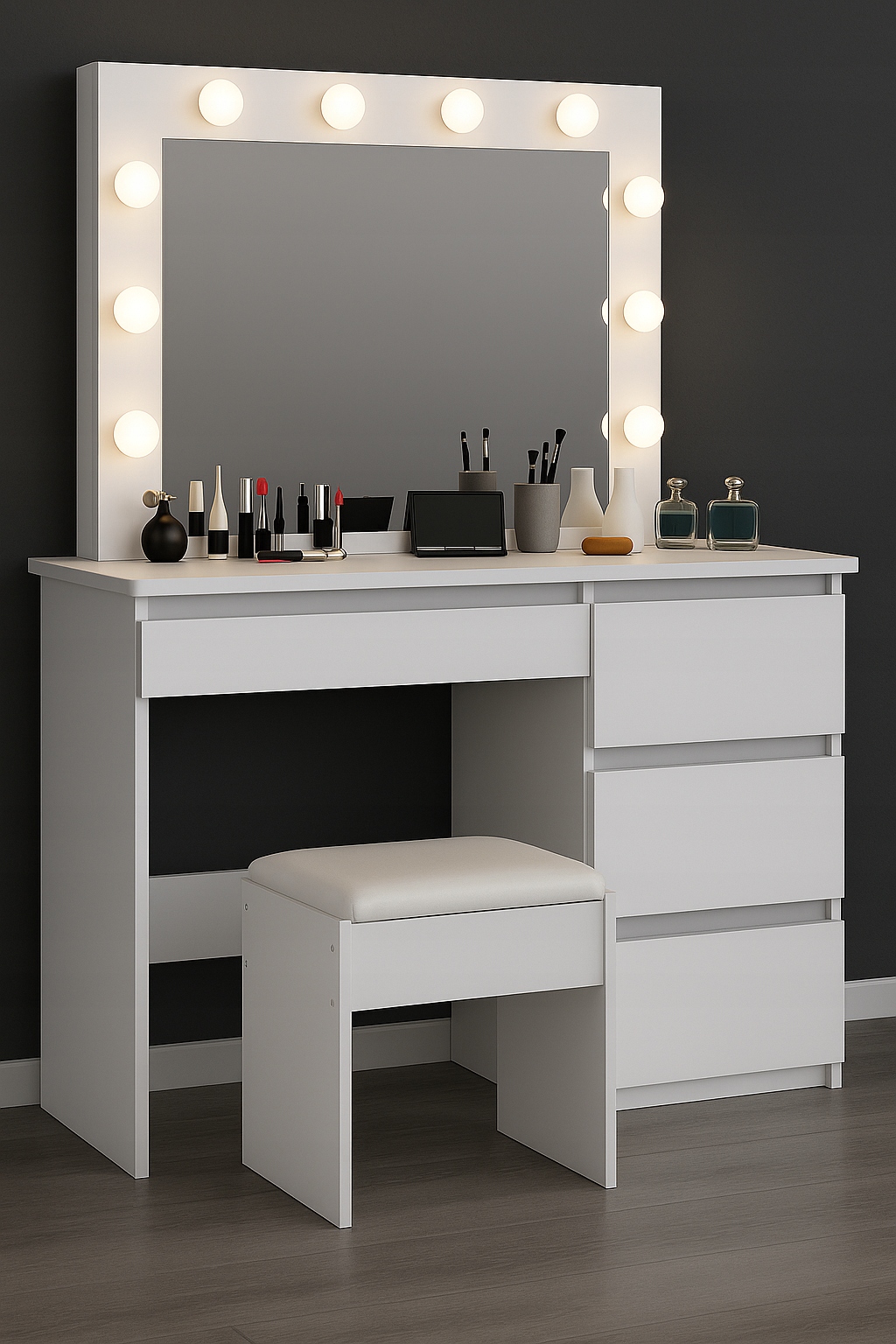 Na powierzchni toaletki znajduje się wbudowane oświetlenie LED, które zapewnia jasne i równomierne światło. To idealne rozwiązanie do precyzyjnego makijażu i pielęgnacji skóry, nawet w słabym oświetleniu.