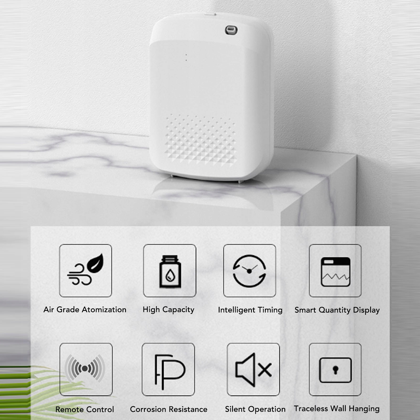 3. ZALETY: Dyfuzor zapachowy ma takie zalety, jak atomizacja powietrza, inteligentny czas, wyświetlanie ilości, niski poziom hałasu, cicha praca, zdalne sterowanie Bluetooth itp.
