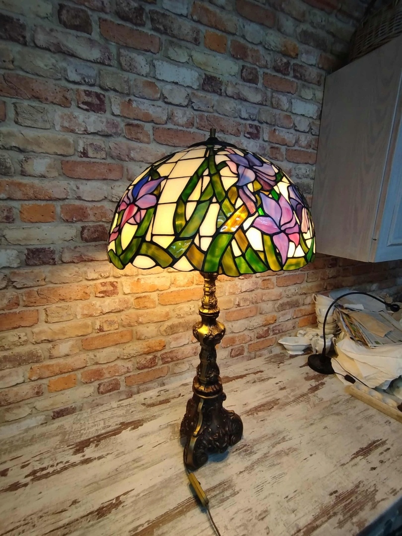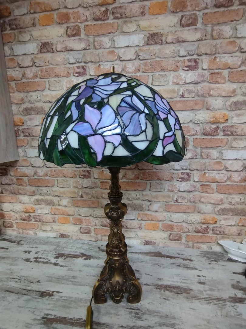 Przedmiotem sprzedaży jest lampa witrażowa Tiffany , przepiękne kolory , lampa w bardzo dobrym stanie, wys. 83 cm, średnica klosza 46 cm, wys. klosza 25 cm. Noga stabilna i ciężka- mosiężny odlew. Polecamy !