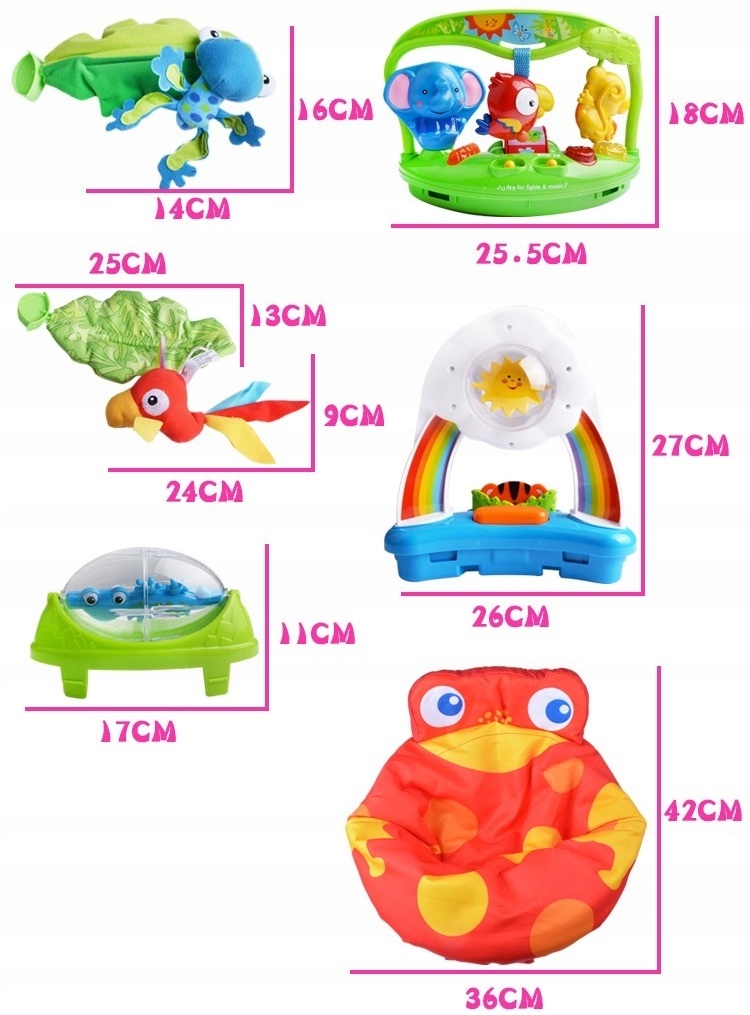 Zabawka posiada bardzo żywe kolory, które przyciągają wzrok maluszka i zapewniają wiele uciechy. Wspomaga prawidłowy rozwój dziecka, rozwija zdolności manualne i motoryczne. Zabawki przedstawiają różne kolorowe zwierzątka, które pomogą rozwinąć zmysł dotyku oraz wzroku. Konstrukcja oraz sprężyny są bezpieczne, dzięki czemu dziecko może skakać w górę i dół. Posiada wygodne siedzisko obrotowe 360 stopni, zapewniając dziecku dostęp do wszystkich zabawek, które go otaczają. Wspomaga to rozwój sprawności ruchowej. Siedzisko jest wyjmowane, można je prać. Posiada 3stopniową regulację wysokości siedziska w zależności od wzrostu dziecka. Składanie w celu przechowywania odbywa się w prosty sposób.