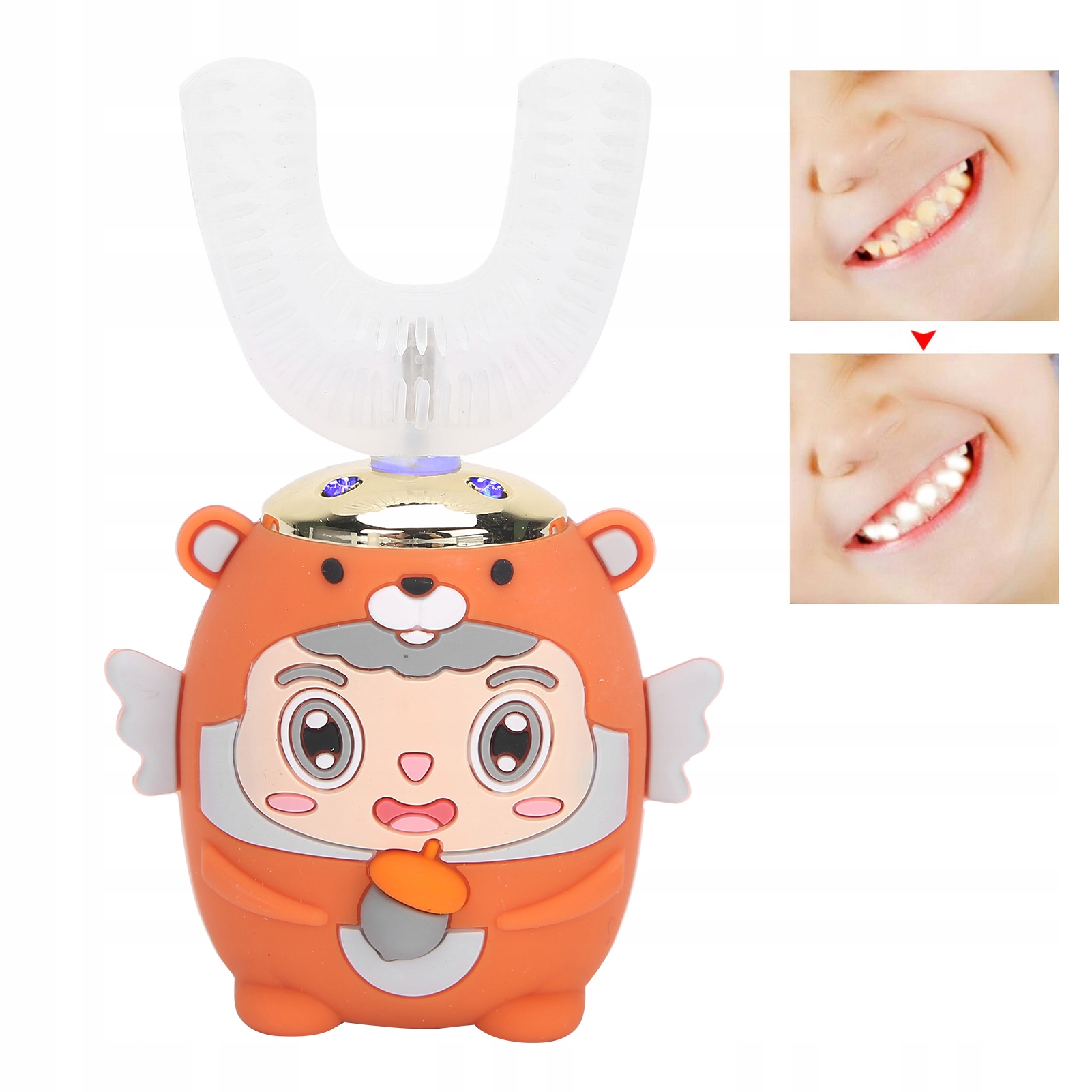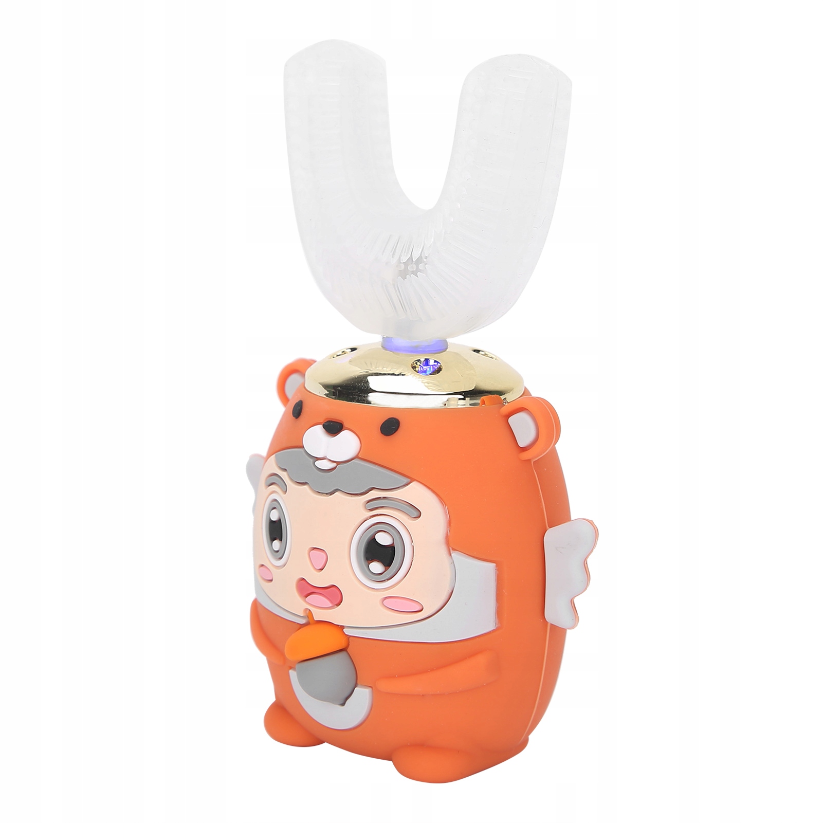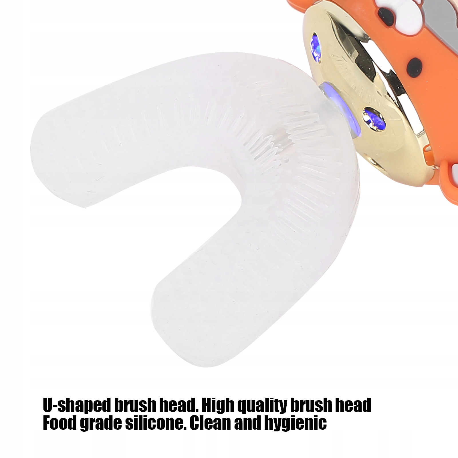 1. Główka szczoteczki do zębów w kształcie litery U, dopasowana i czysta pod kątem 360 stopni, dopasowuje się do budowy jamy ustnej człowieka, otacza zęby i skutecznie czyści.